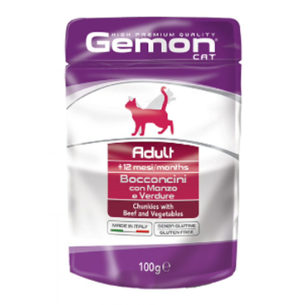Gemon Pouch Cat Adult Beef/Veg - это полноценный корм для взрослых кошек в возрасте от 12 месяцев и более. Вкусный натуральный рецепт со свежим итальянским мясом без глютена.