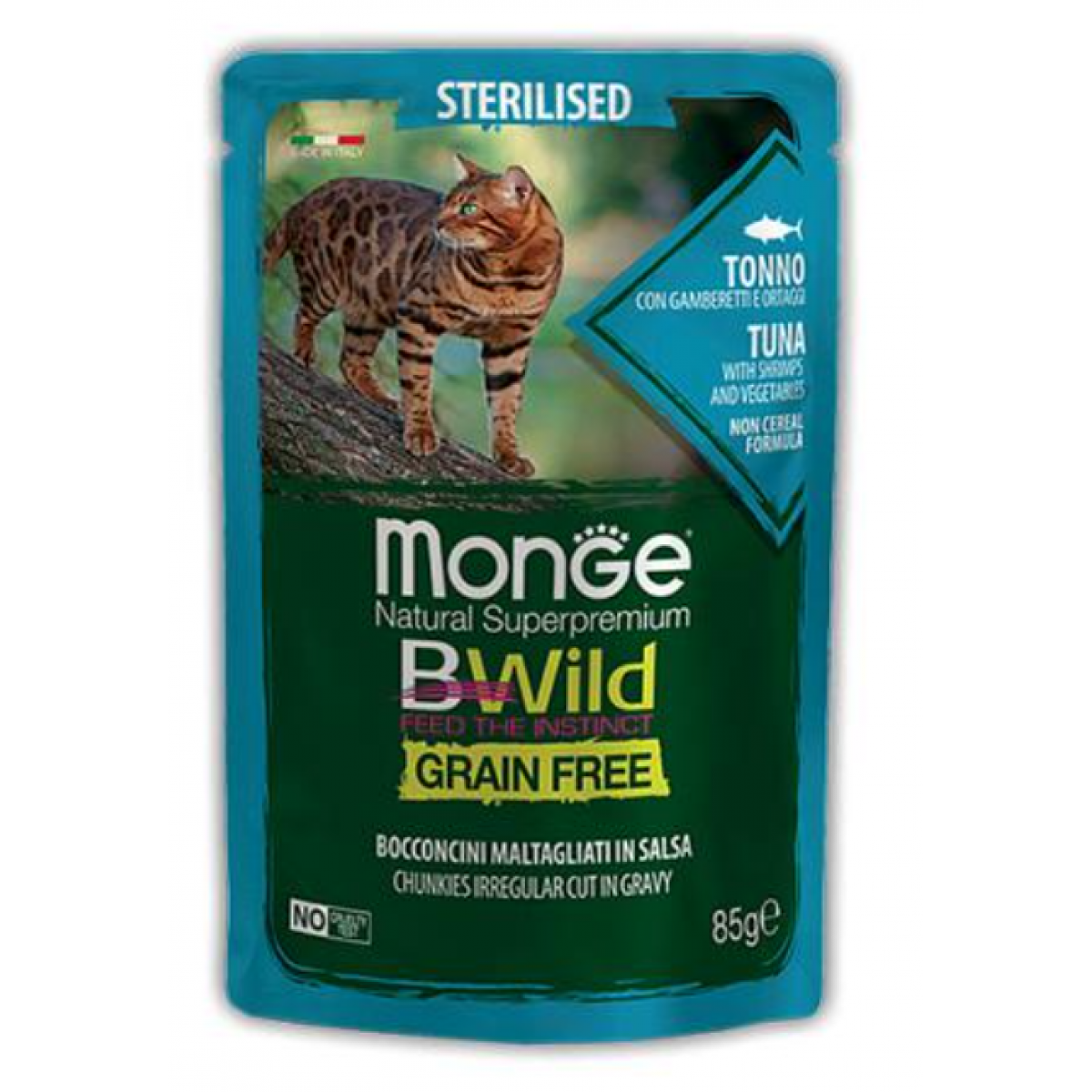 Monge Пауч BWild GF Sterilised Cat (Тунец, овощи) (зеленая фасоль и морковь) — это полноценное сбалансированное питание для взрослых стерилизованных кошек.