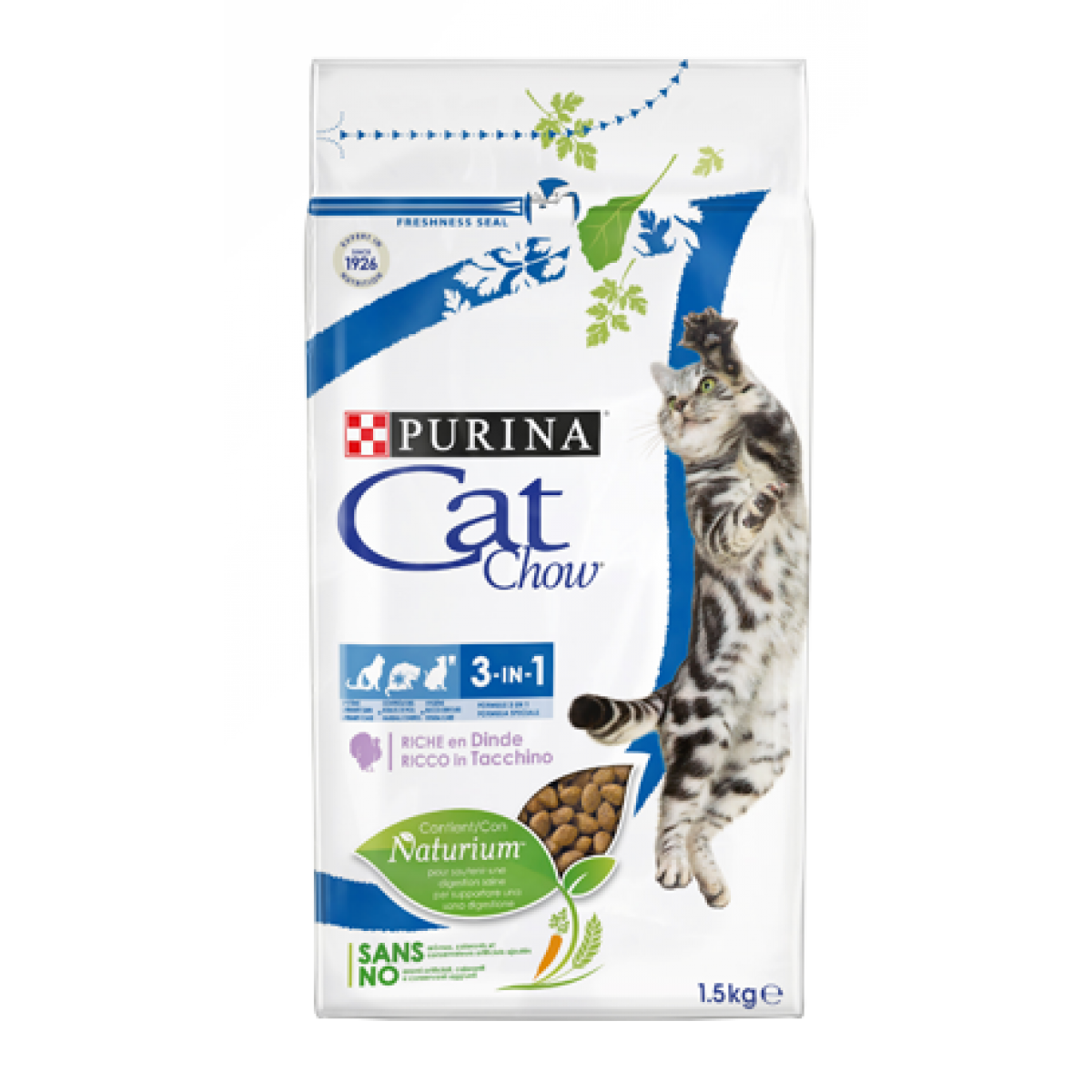 Описание товараСбалансированный сухой корм для взрослых кошек Cat Chow 3in1 (тройная защита) с индейкой — корм с качественным белком и натуральными ингредиентами (петрушка, шпинат, морковь, цельные зерна злаков, цикорий и дрожжи).