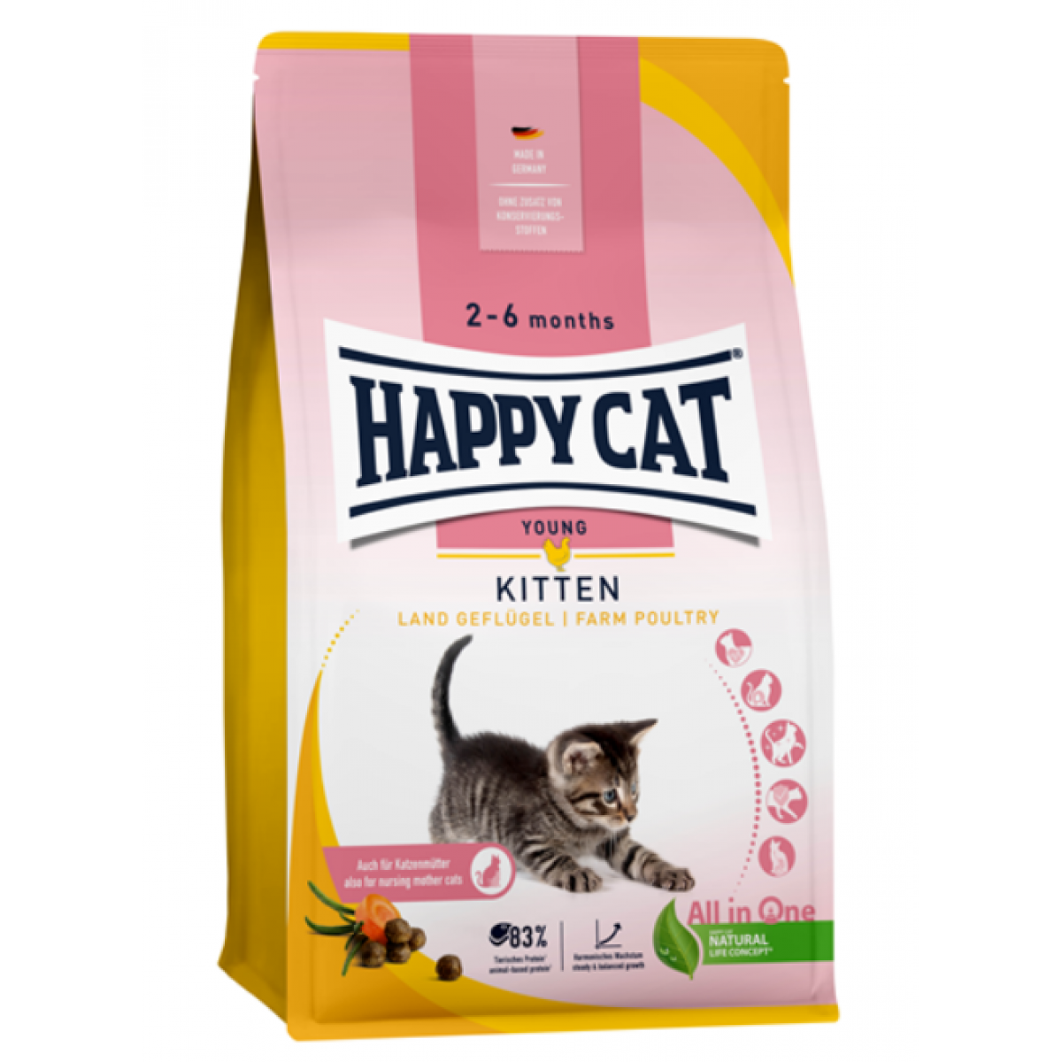 All in One – инновационная программа комплексного питания для кошек на всех стадиях развития. Е отличительные особенности: контроль выведения шерсти, таурин и большое количество высококачественного белка животного происхождения, контроль за уровнем pH для здоровья мочевыводящих путей, уход за зубами, омега-3- и омега-6-жирные кислоты для здоровой кожи и шерсти, а также гарантия превосходного вкуса и уникальная формула Happy Cat Natural Life Concept®.