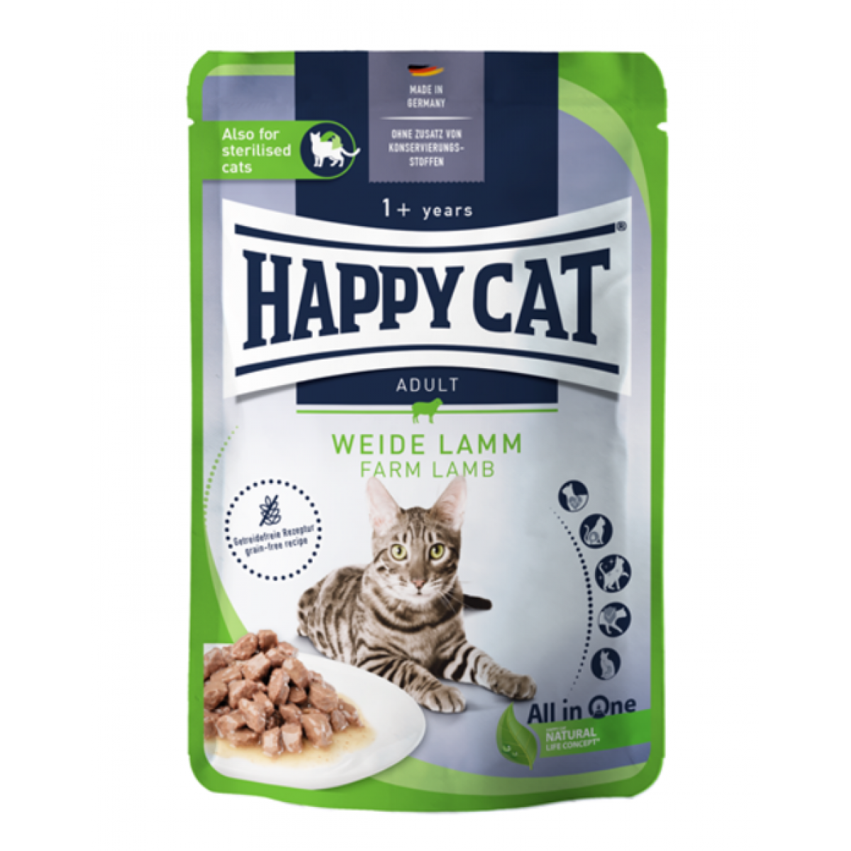 Happy Cat Culinary Adult Lamb - Culinary Meat in Sauce WeideLamm - влажный корм для кошек с ягненком, более 90 процентов животного белка в общем количестве белка, легко усваивается, подходит для питомцев с чувствительным ЖКТ – и при этом очень вкусный. Беззерновой влажный корм для кошек с высоким содержанием мяса особенно подходит для кастрированных и стерилизованных котов и кошек.