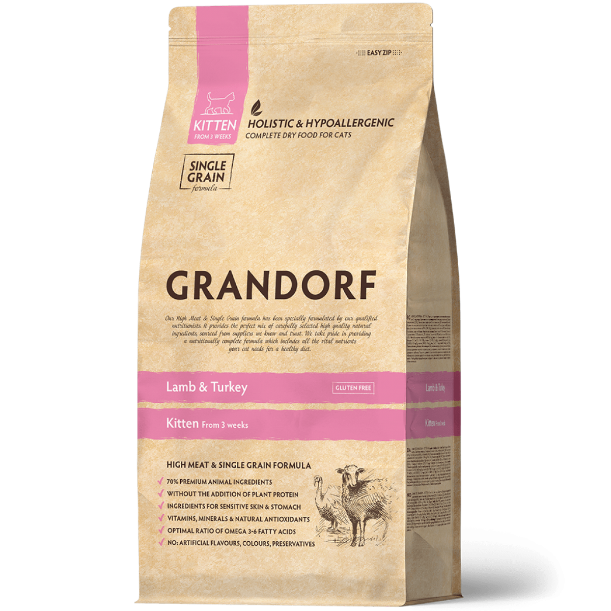 Grandorf Kitten (Ягненок и рис) - это низкозерновой гипоаллергенный рацион для котят старше 3 недель, а также кормящих и беременных кошек.