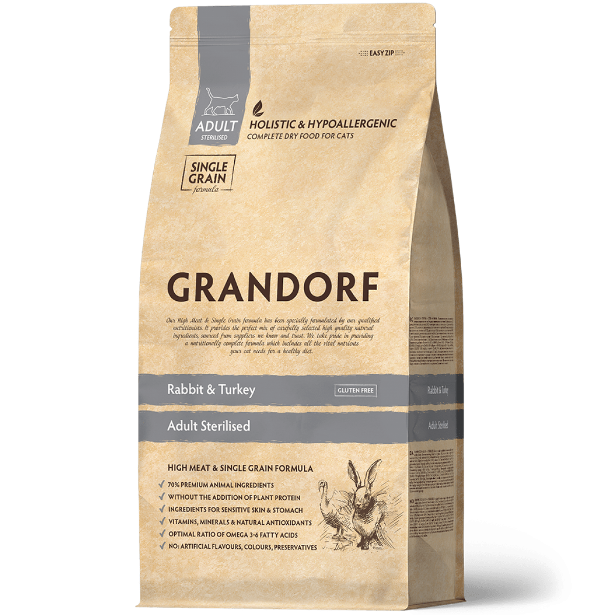 Grandorf Cat Sterilized (Кролик и рис)- это низкозерновой гипоаллергенный рацион для стерилизованных кошек.