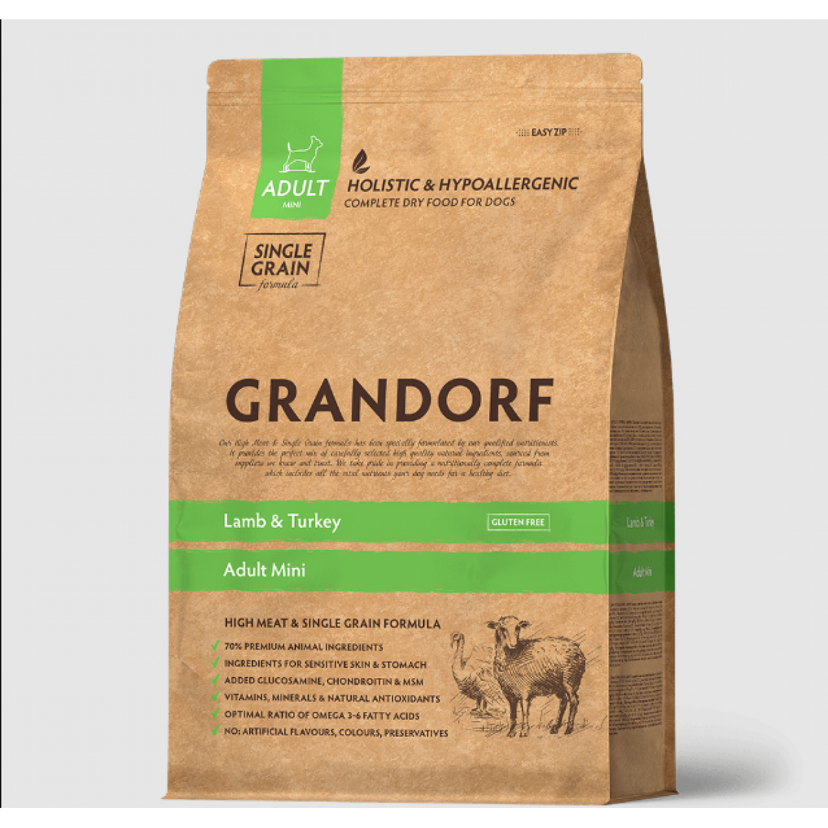 Grandorf Adult Mini (Ягненок, индейка) - это гипоаллергенный корм для взрослых собак мелких пород старше 1 года.