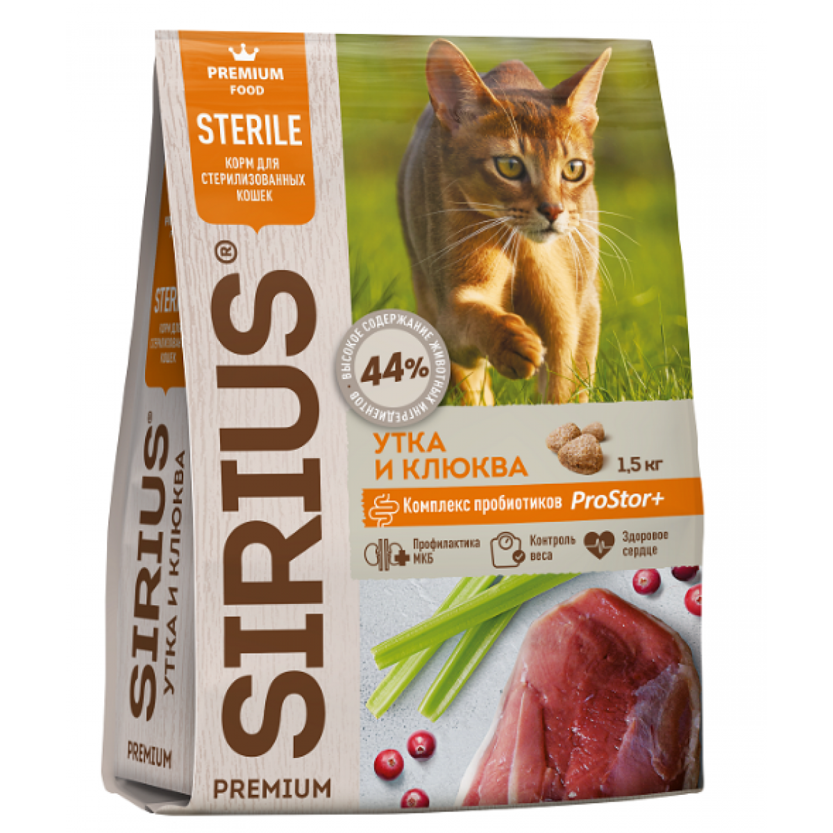 SIRIUS — сухой корм премиум-класса для полноценного ежедневного рациона стерилизованных кошек. Высокое содержание мясных ингредиентов обеспечивает оптимальный уровень белка и укрепляет мышцы. Пониженное содержание жиров для контроля веса. Баланс витаминов и комплекса пробиотиков 4-го поколения PROSTOR+ нормализует пищеварение и укрепляет иммунитет. Омега 3 и Омега 6 способствуют поддержанию здоровья сердца, мозга, нервной системы, здоровья кожи и красоты шерсти. Корм способствует профилактике мочекаменной болезни.