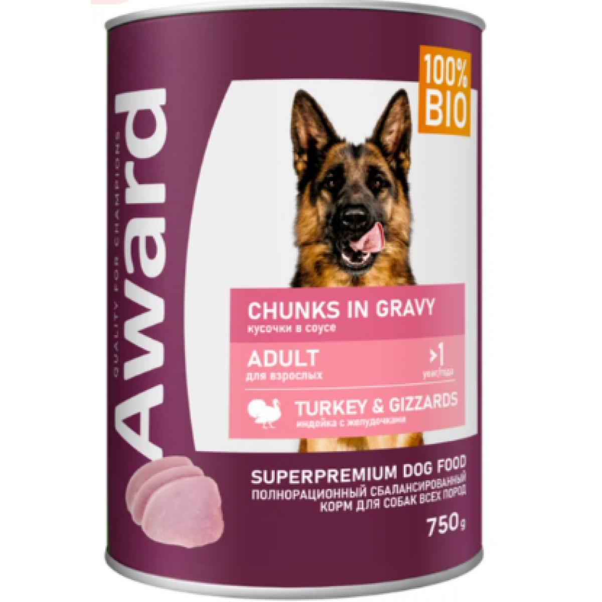 Влажный корм AWARD для взрослых собак кусочки с индейкой и желудочками в соусе