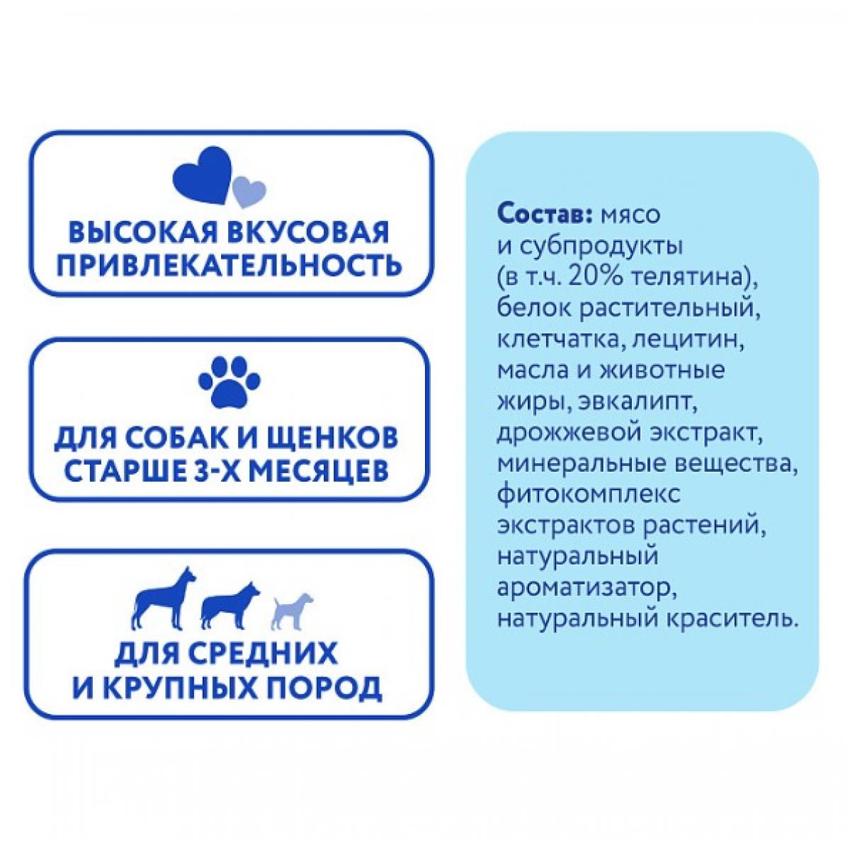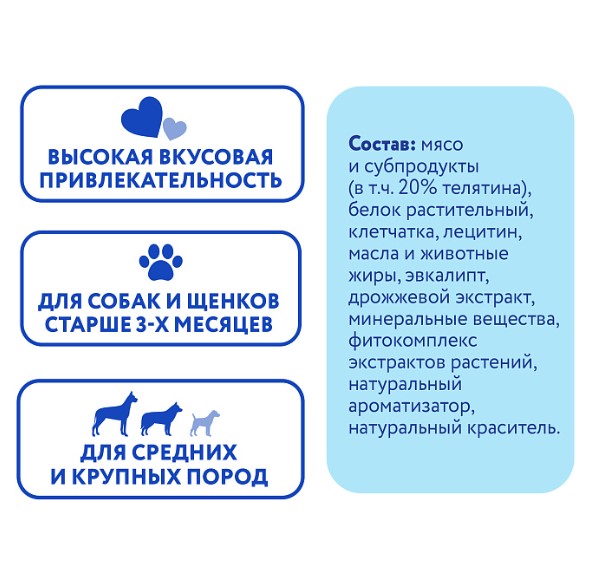 Ингредиенты: мясо и субпродукты (в том числе 20% телятина), белок растительный, клетчатка, лецитин, масла и животные жиры, эвкалипт, дрожжевой экстракт, минеральные вещества, фитокомплекс экстрактов растений, натуральный ароматизатор, натуральный краситель