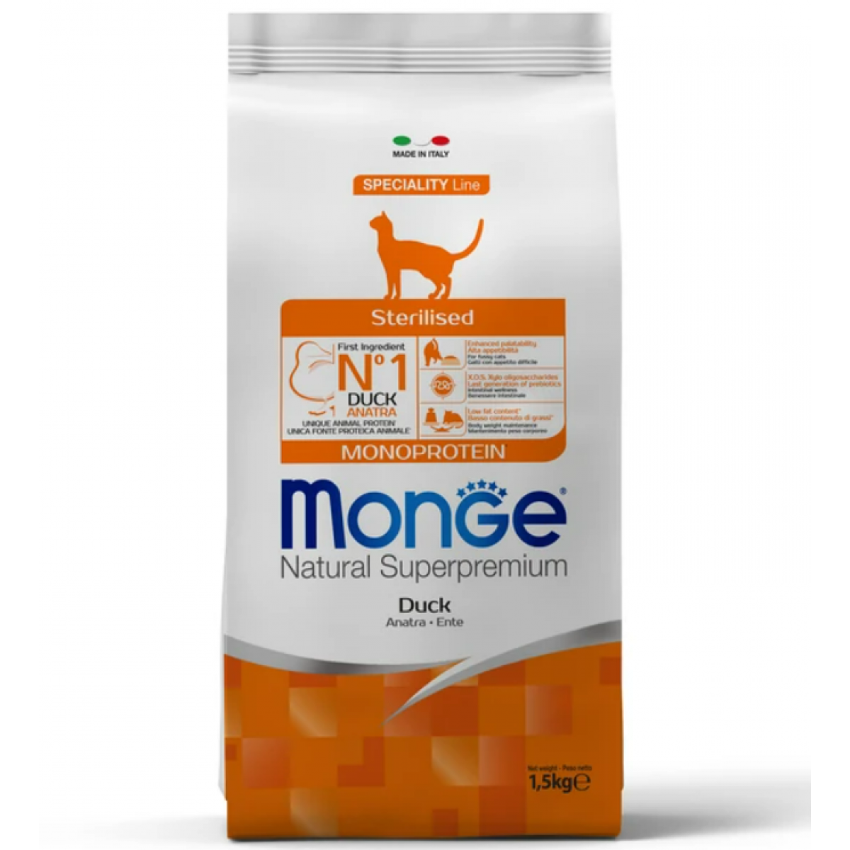 Monge Cat Monoprotein Sterilised (Утка) - это монобелковый корм для взрослых стерилизованных кошек с уткой.