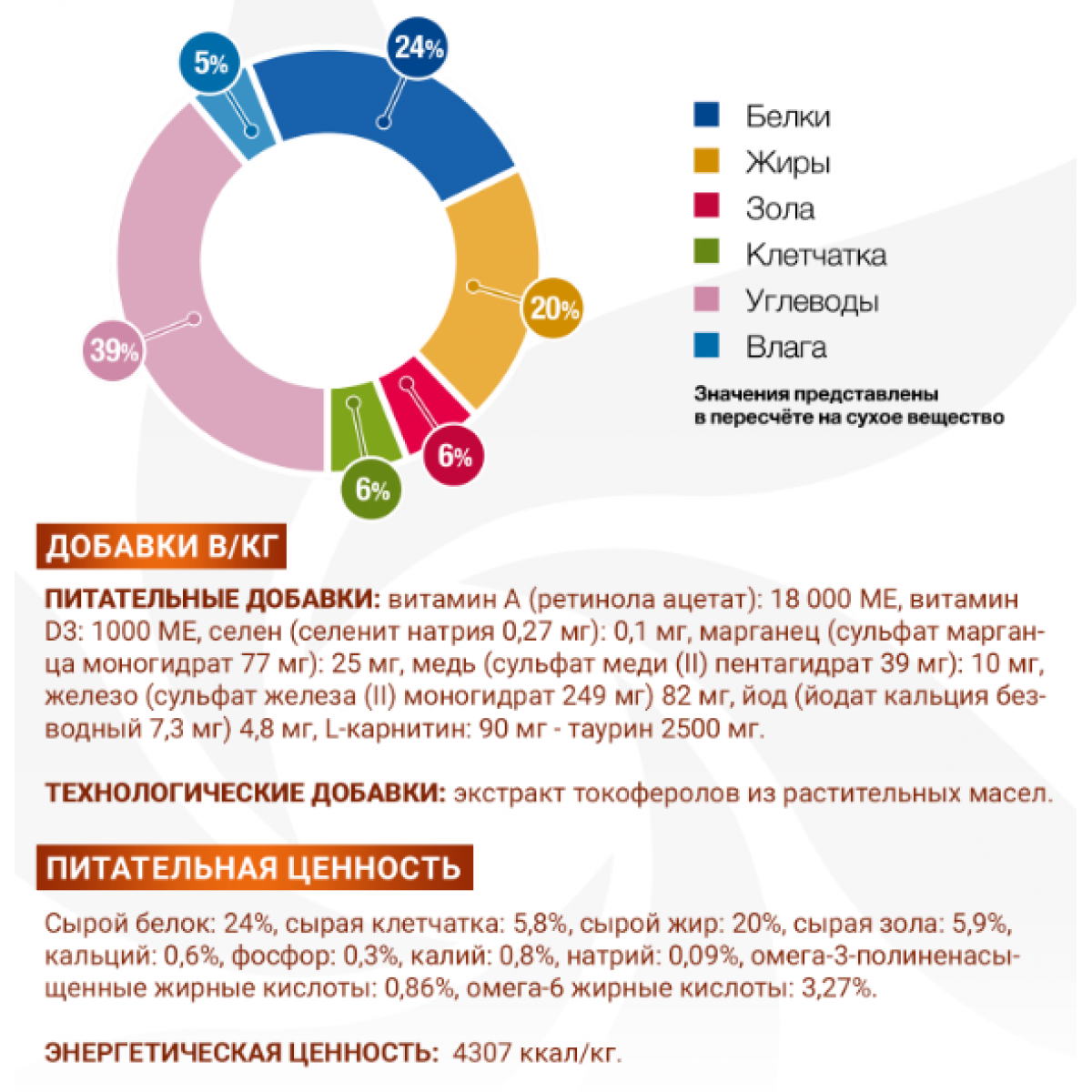 Питательные добавки: витамин А (ретинола ацетат): 18 000 МЕ, витамин D3: 1000 МЕ, селен (селенит натрия 0,27 мг): 0,1 мг, марганец (сульфат марганца моногидрат 77 мг): 25 мг, медь (сульфат меди (II) пентагидрат 39 мг): 10 мг, железо (сульфат железа (II) моногидрат 249 мг) 82 мг, йод (йодат кальция безводный 7,3 мг) 4,8 мг, L-карнитин: 90 мг - таурин 2 500 мг.