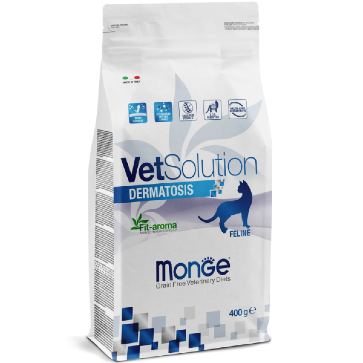 Лечебный корм Monge (Монж) VetSolution Cat Dermatosis для кошек при заболеваниях кожи таких как дерматит, хронический зуд, заболевания кожи, сопровождающиеся воспалением при пищевой аллергии и пищевой непереносимости.