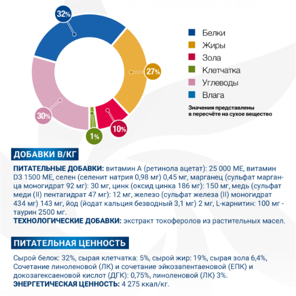 Питательная ценность: сырой белок: 32%, сырая клетчатка: 5%, сырой жир: 19%, сырая зола 6,4%, Сочетание линоленовой (LA) и сочетание эйкозапентаеновой (EPA) и докозагексаеновой кислот (DHA): 0,75%, линоленовой (LA) 3%.