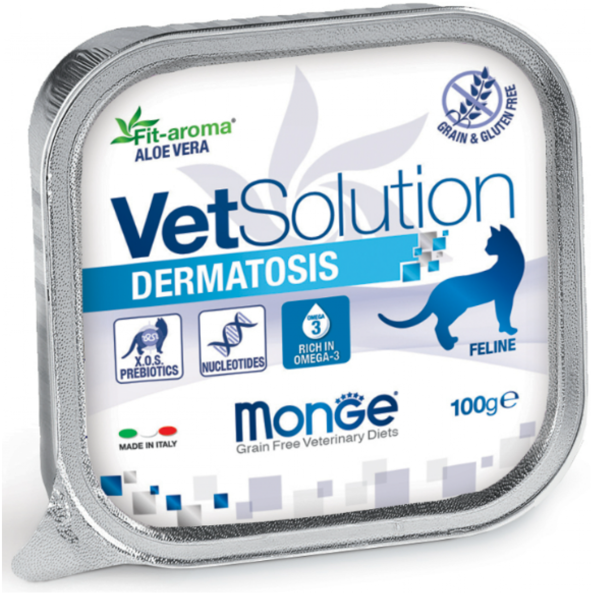 Лечебный корм Monge VetSolution Cat Dermatosis Дерматозис для кошек при заболеваниях кожи таких как дерматит, хронический зуд, заболевания кожи, сопровождающиеся воспалением при пищевой аллергии и пищевой непереносимости 100 г.
