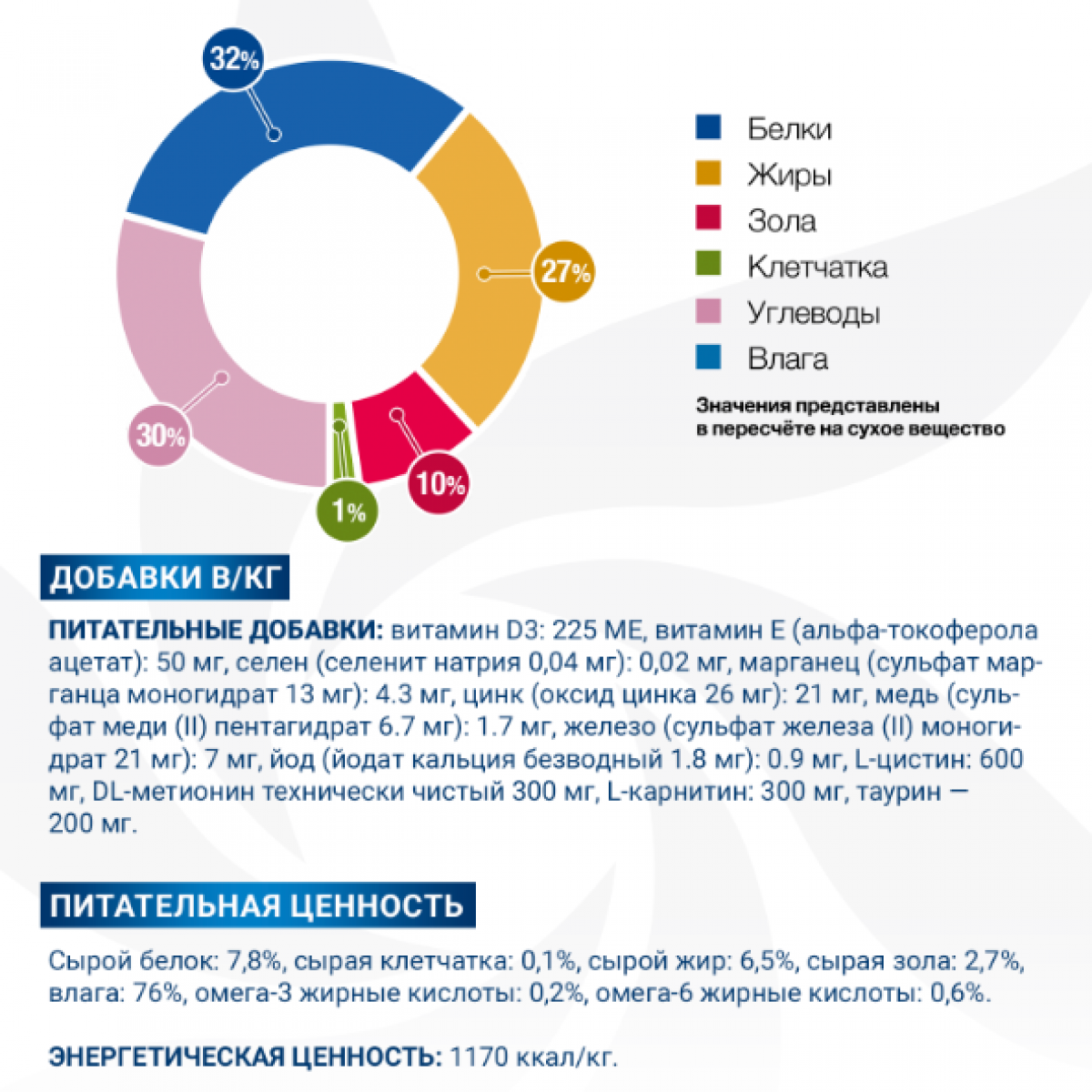 Питательная ценность: сырой белок 7,8%, сырая клетчатка 0,1%, сырой жир 6,5%, сырая зола 2,7%, влага 76%, омега-3 жирные кислоты 0,2%, омега-6 жирные кислоты 0,6%.