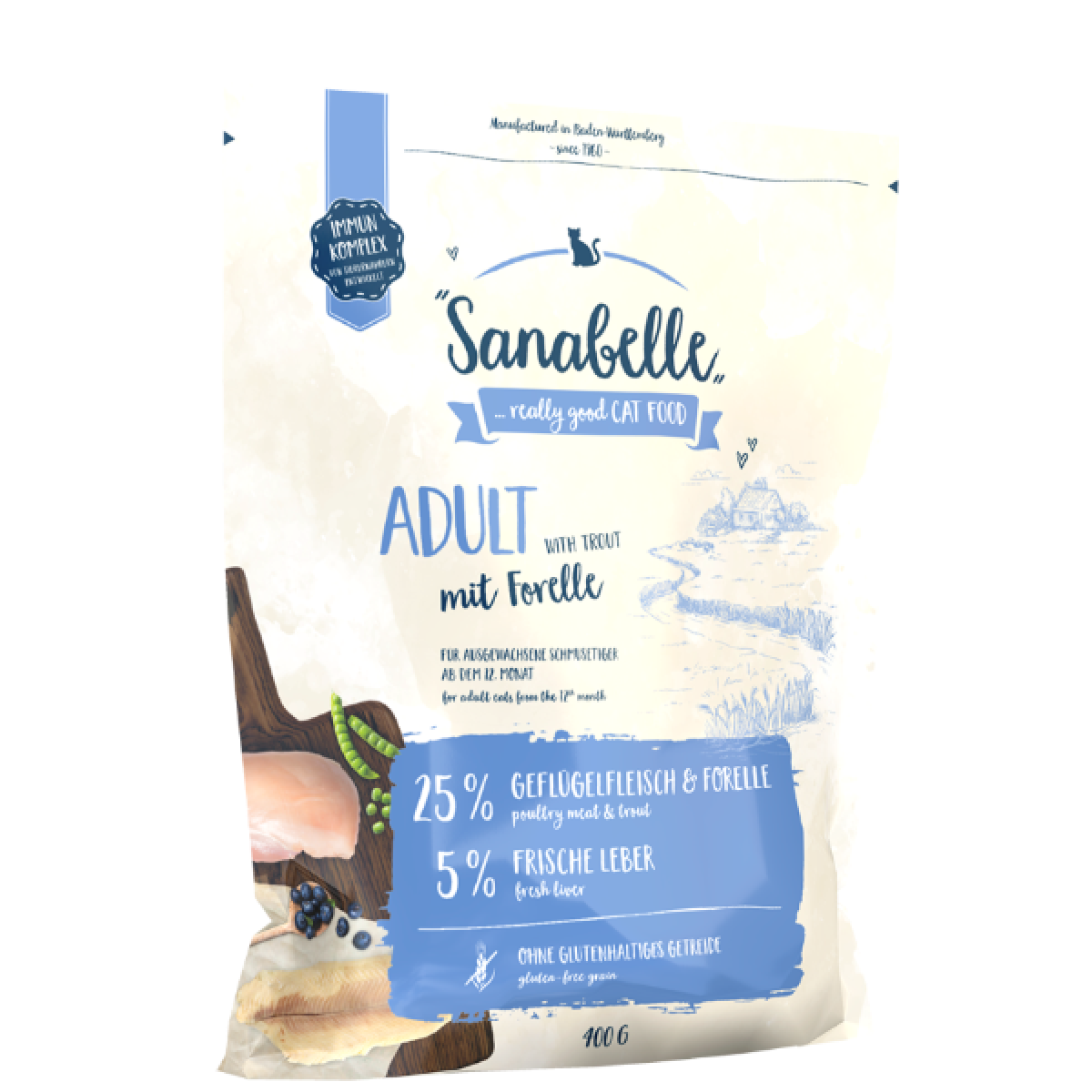 Bosch Sanabelle Adult with Trout (Форель) - полностью сбалансированный высококачественный сухой корм для взрослых кошек всех пород. Данный корм, предназначенный для кошек в возрасте старше одного года с достаточно малой подвижностью.