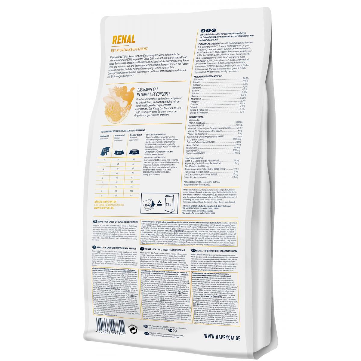 Happy Cat VET Diet Renal - корм для кошек с хронической почечной недостаточностью, гипертензией, нефритом. Сниженное содержание фосфора, натрия и протеина в соответствии с минимальными потребностями. Стимуляция аппетита за счет повышенной вкусовой привлекательности.