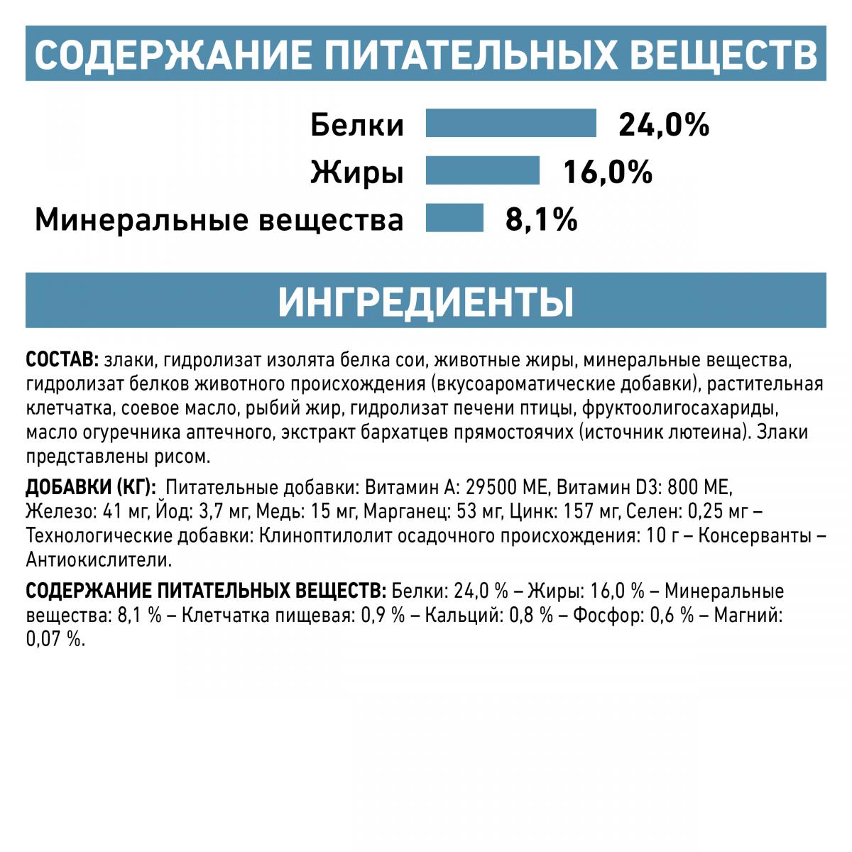 ИНГРЕДИЕНТЫ: злаки, гидролизат изолята белка сои, животные жиры, минеральные вещества, гидролизат белков животного происхождения (вкусоароматические добавки), растительная клетчатка, соевое масло, рыбий жир, гидролизат печени птицы, фруктоолигосахариды, масло огуречника аптечного, экстракт бархатцев прямостоячих (источник лютеина).