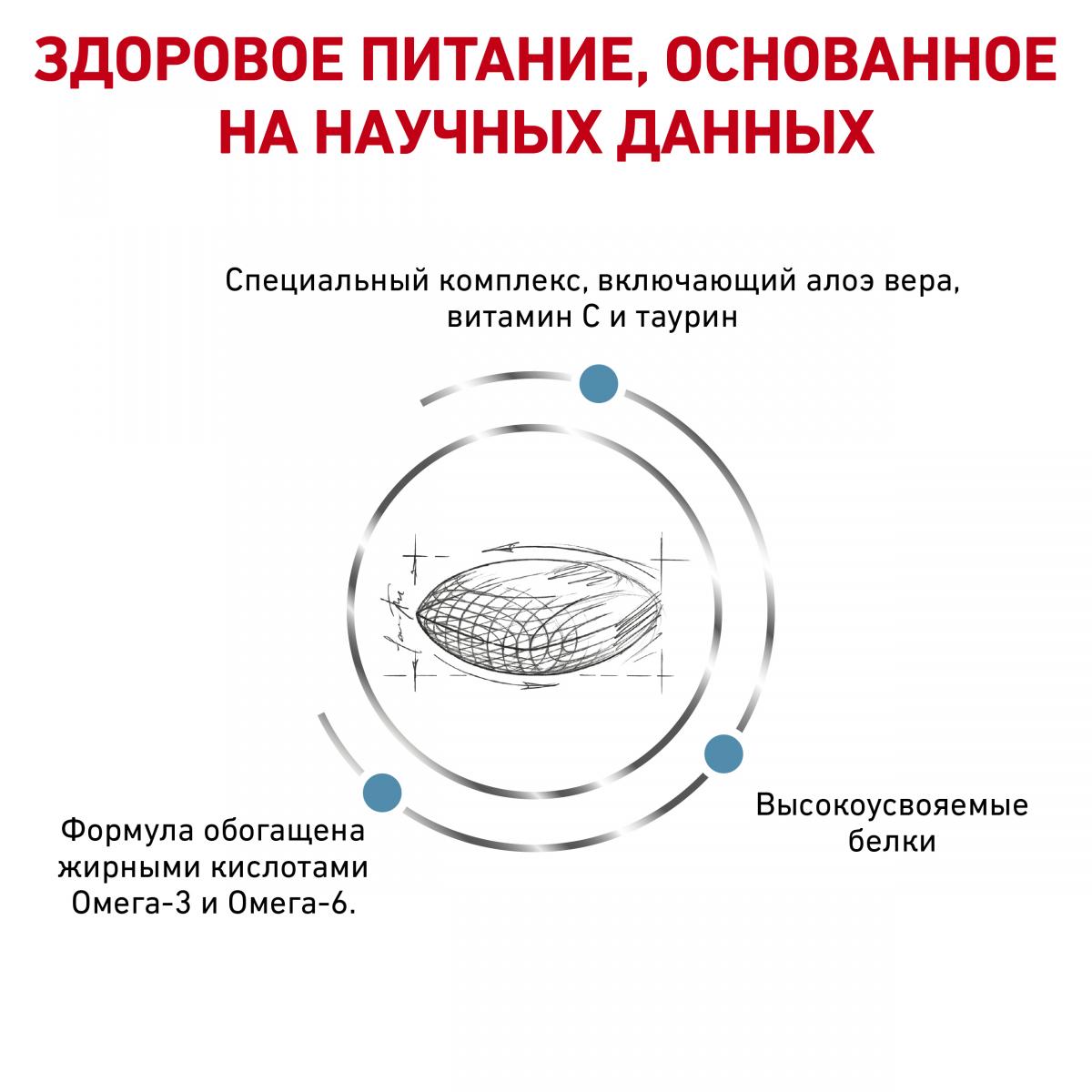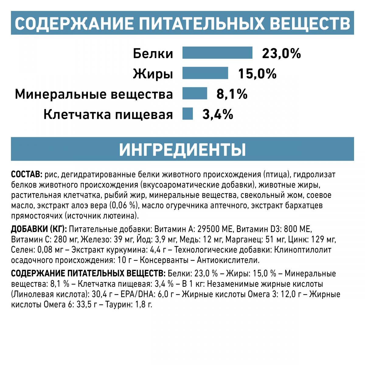 ИНГРЕДИЕНТЫ: рис, дегидратированные белки животного происхождения (птица), гидролизат белков животного происхождения (вкусоароматические добавки), животные жиры, растительная клетчатка, рыбий жир, минеральные вещества, свекольный жом, соевое масло, экстракт алоэ вера (0,06 %), масло огуречника аптечного, экстракт бархатцев прямостоячих (источник лютеина).