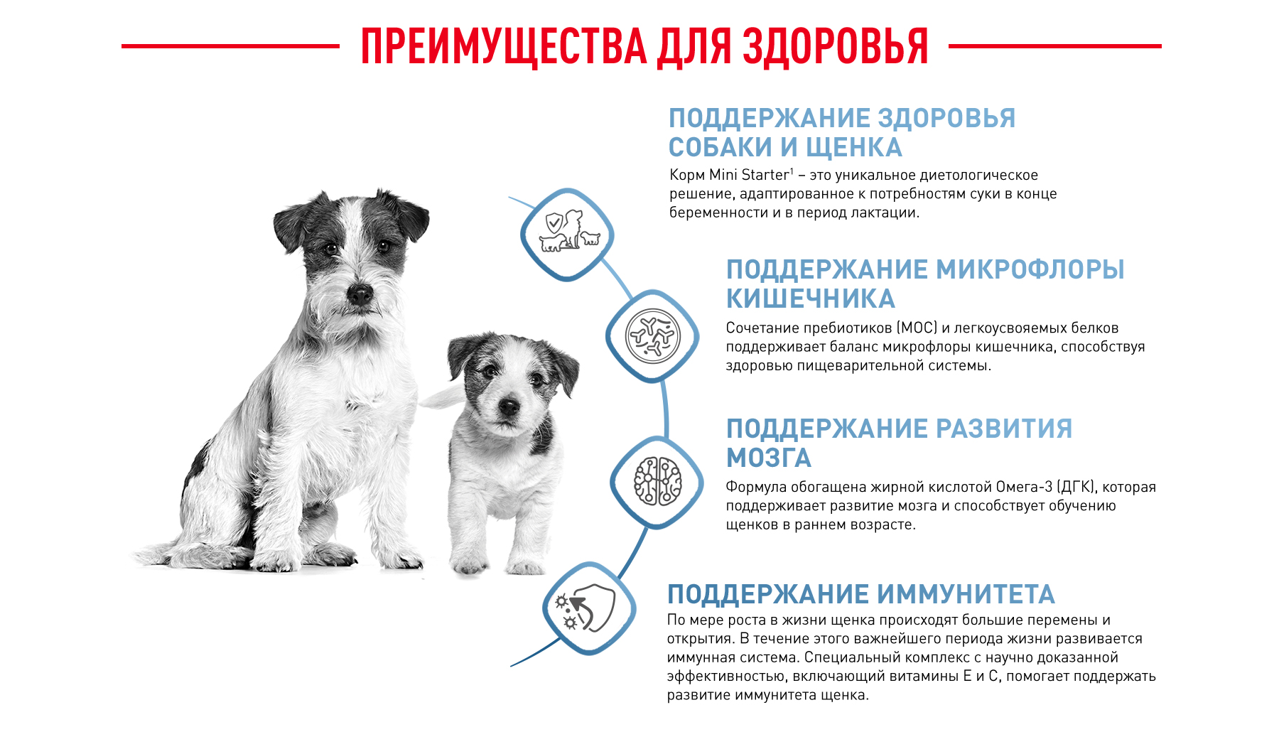 Продукт ROYAL CANIN® Mini Starter Mother & Babydog разработан с учетом потребностей в питательных веществах матери и ее новорожденных щенков. Эта формула подходит для взрослых собак мелких размеров весом до 10 кг, а также для щенков в возрасте до 2 месяцев.