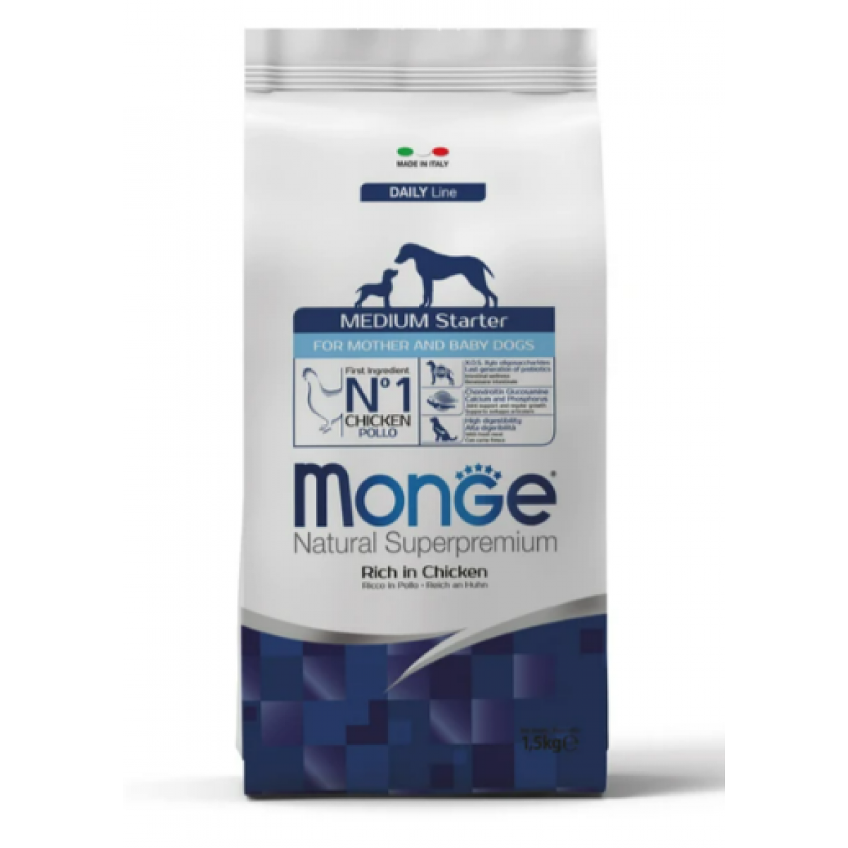 MONGE SUPERPREMIUM DOG MEDIUM STARTER FOR MOTHER AND BABY - это полноценный сбалансированный рацион для щенков средних пород в период начала прикорма. Корм отлично усваивается и способствует правильному развитию щенка. Корм также рекомендуется во время беременности и лактации.