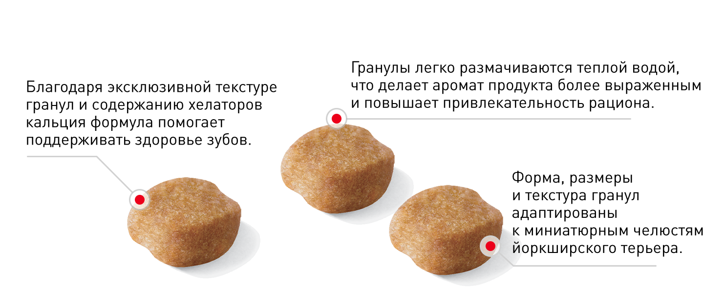 Форма, размер, текстура и состав крокет специально разработаны с учетом небольшого размера челюстей стареющих собак породы Йоркширский терьер. Продукт содержит необходимые для поддержания здоровья зубов хелаторы кальция. Крокеты можно размягчить с помощью теплой воды, что способствует усилению аромата и облегчает поедание корма.