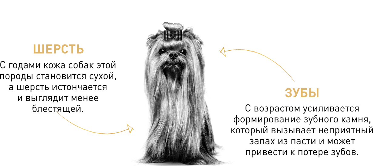 Шерсть собак породы Йоркширский терьер отличается постоянным ростом и естественной мягкостью. Эксклюзивная формула корма помогает поддерживать здоровье длинной шерсти благодаря содержанию адаптированного количества Омега 3 и Омега 6 жирных кислот, а также масла огуречника аптечного и биотина.