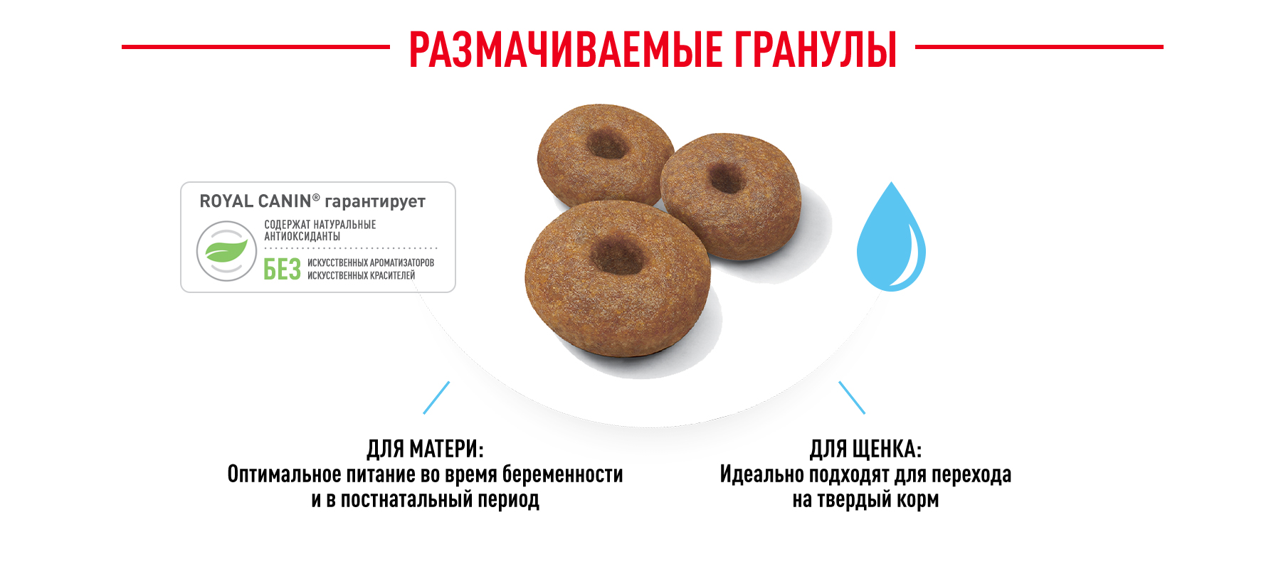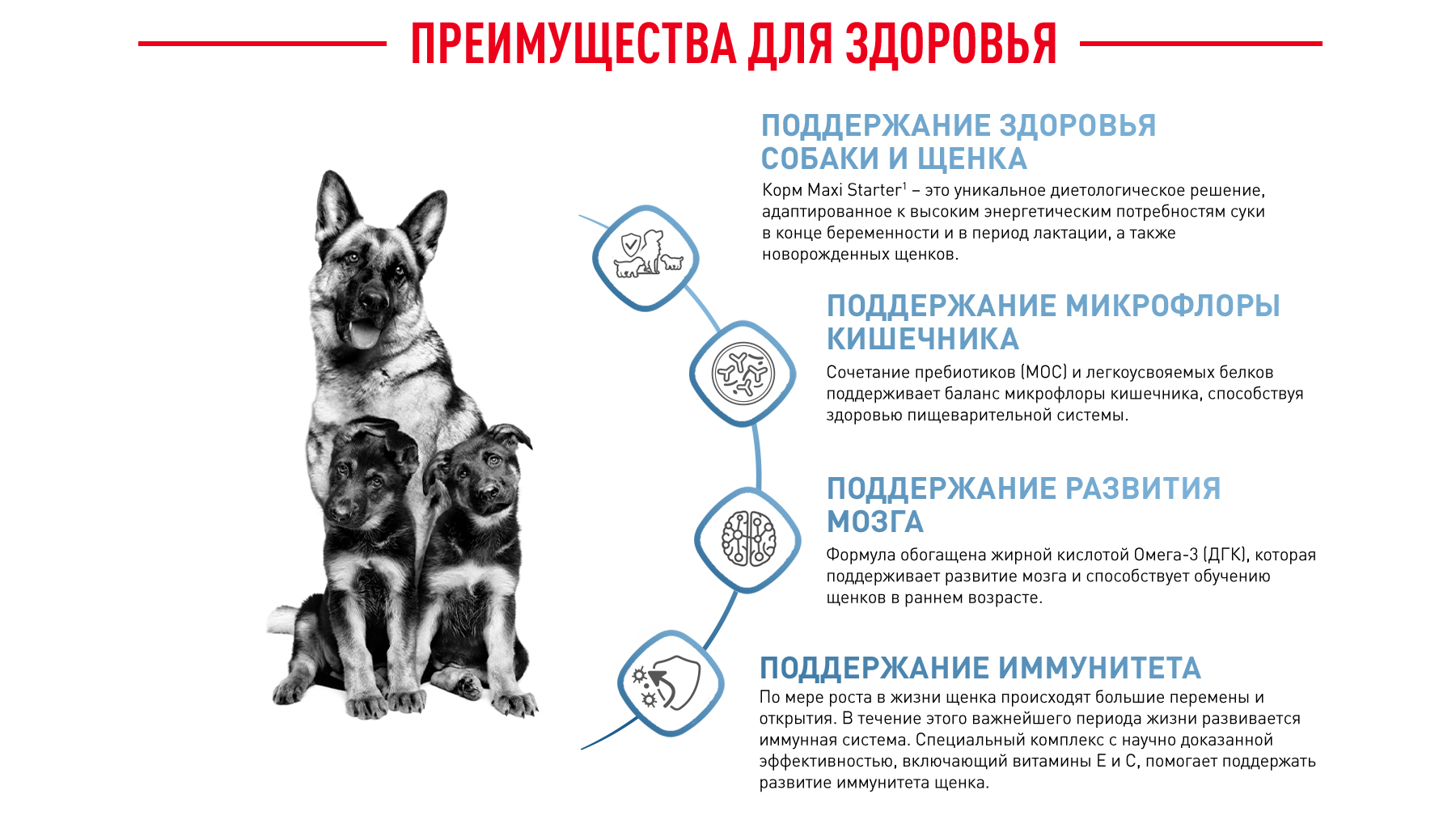 Продукт ROYAL CANIN® Maxi Starter Mother & Babydog разработан с учетом потребностей в питательных веществах матери и ее новорожденных щенков. Эта формула подходит для взрослых крупных собак весом от 26 до 44 кг, а также для щенков в возрасте до 2 месяцев.Специально разработанный рацион удовлетворяет высокие энергетические потребности матери крупных размеров, а также поддерживает здоровое развитие щенков, в том числе щенков из больших пометов.Поддерживает формирование здоровой иммунной системы щенка за счет включения в состав продукта комплекса питательных веществ с научно доказанной эффективностью, в том числе витаминов E и C.Благодаря сочетанию полезных пребиотиков и легкоусвояемых белков формула помогает поддерживать баланс микрофлоры кишечника, способствуя здоровому пищеварению.Гранулы ROYAL CANIN® Maxi Starter Mother & Babydog легко размачиваются до консистенции каши и обладают высокой вкусовой привлекательностью для щенков в период отъема.Через 8 недель потребности вашего щенка в питательных веществах изменятся. Ему будет необходим другой рацион, разработанный специально для следующей фазы роста. В этом возрасте вы сможете перевести своего питомца на корм ROYAL CANIN® Maxi Puppy.