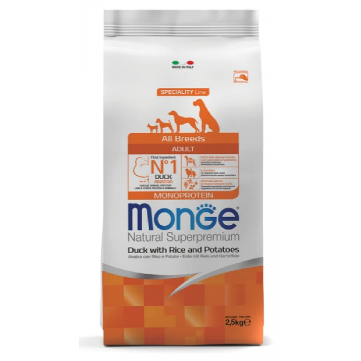 MONGE SPECIALITY LINE ALL BREEDS ADULT DUCK, RICE & POTATOES - это полноценный сбалансированный рацион для взрослых собак всех пород с особыми потребностями. В состав входят отборные гипоаллергенные источники белка животного происхождения, что позволяет легко исключить из рациона ингредиенты, вызывающие аллергию.