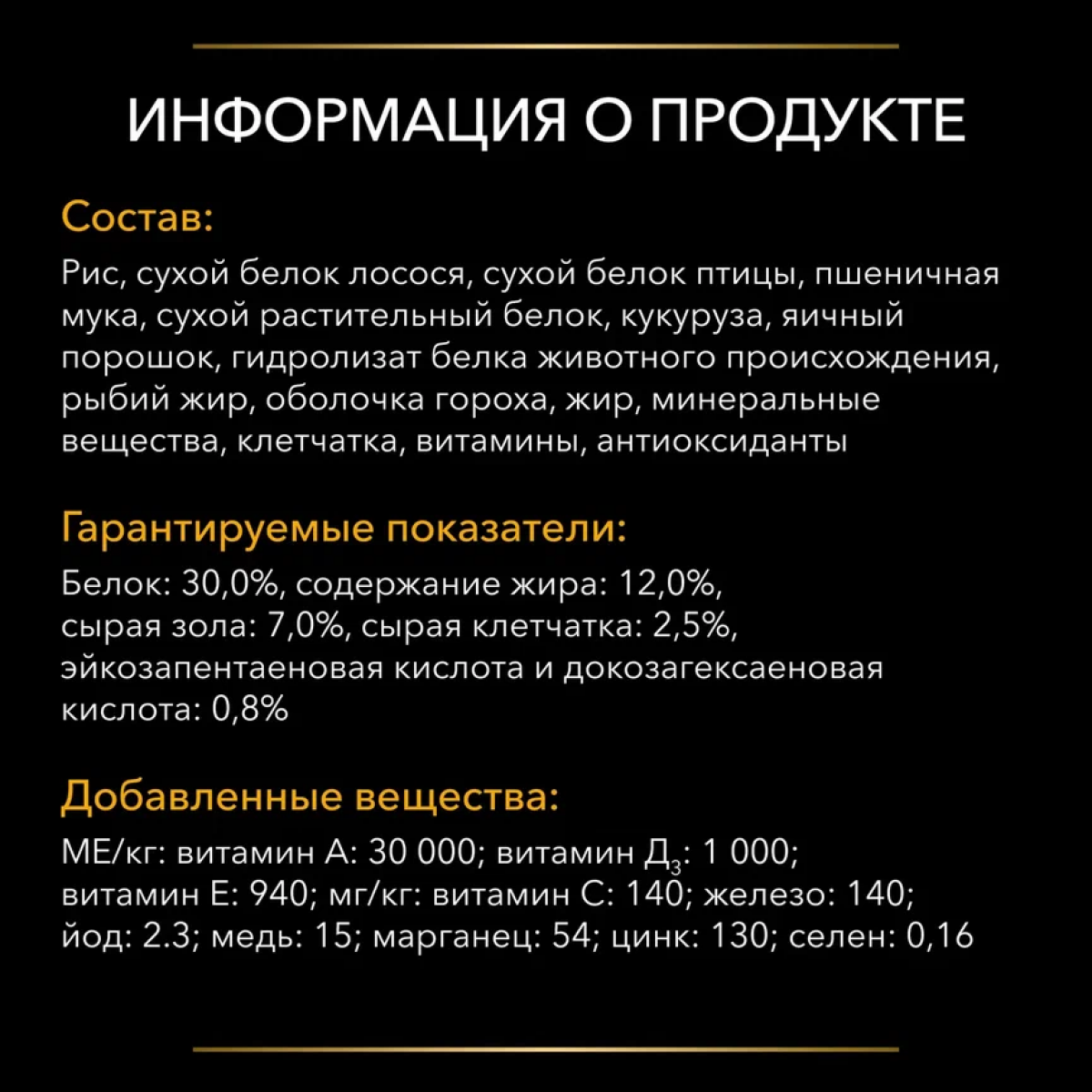 Рис, сухой белок лосося, пшеничная мука, сухой белок птицы, кукурузный глютен, яичный порошок, кукуруза, вкусоароматическая кормовая добавка, рыбий жир, минеральные вещества, витамины, антиоксиданты.