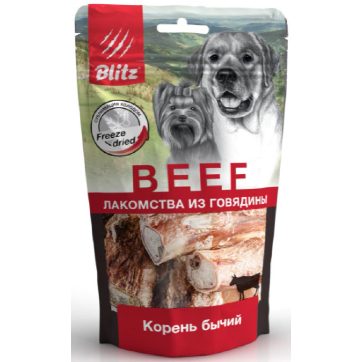 BLITZ Лакомство для собак Бычий корень - лакомство для собак изготовлено из высококачественных говяжьих субпродуктов методом сублимации. Бычий корень (пенис быка) — это ценный субпродукт, содержащий широкий спектр аминокислот, большое количество витаминов и минералов, которые на 95% сохраняются в лакомствах Blitz, ведь процесс сублимации, происходящий при низких температурах и без доступа воздуха, позволяет максимально сохранить качество белка в исходном продукте и предохранить от прогоркания ценные жиры.