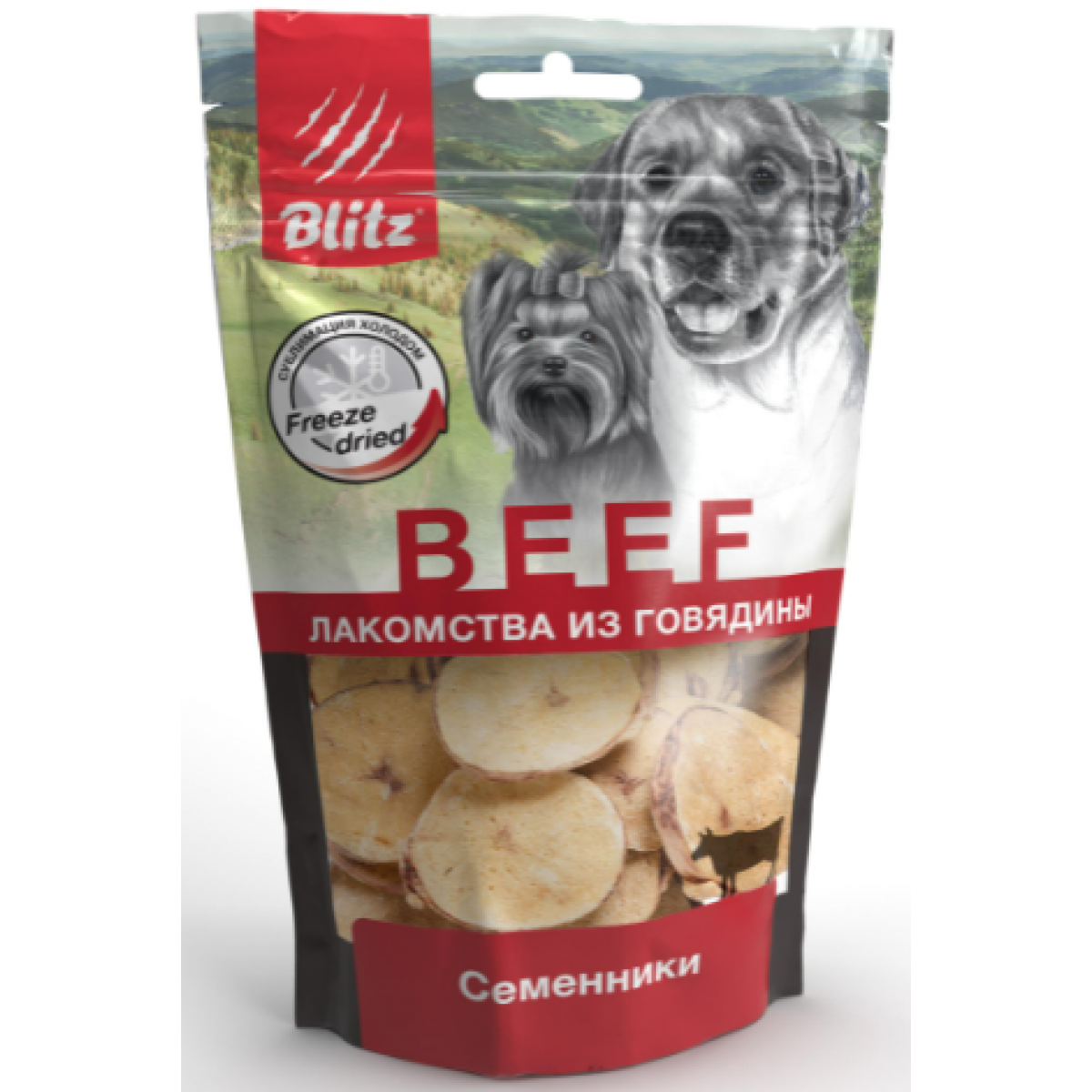 BLITZ Лакомство для собак Семенники - это одно из тех лакомств собак, которые вызывают щенячий восторг даже у взрослых и степенных псов. Представляют собой нарезанные кольцами половые железы молодых бычков (в возрасте до 8 месяцев).