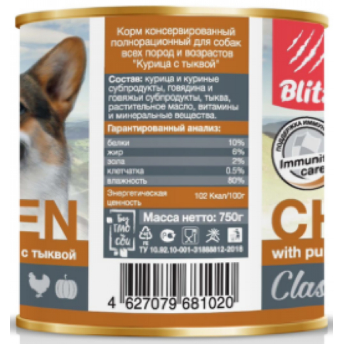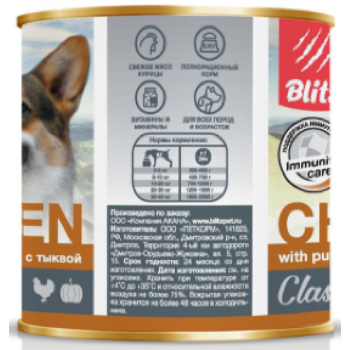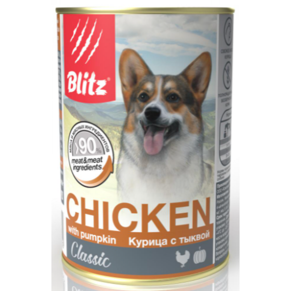 BLITZ Classic Dog Курица с тыквой - это оптимальное сочетание свежего мяса курицы и говядины с аппетитной тыквой в полнорационном влажном корме для собак обеспечивает высокое содержание белка и полезные свойства овощей.