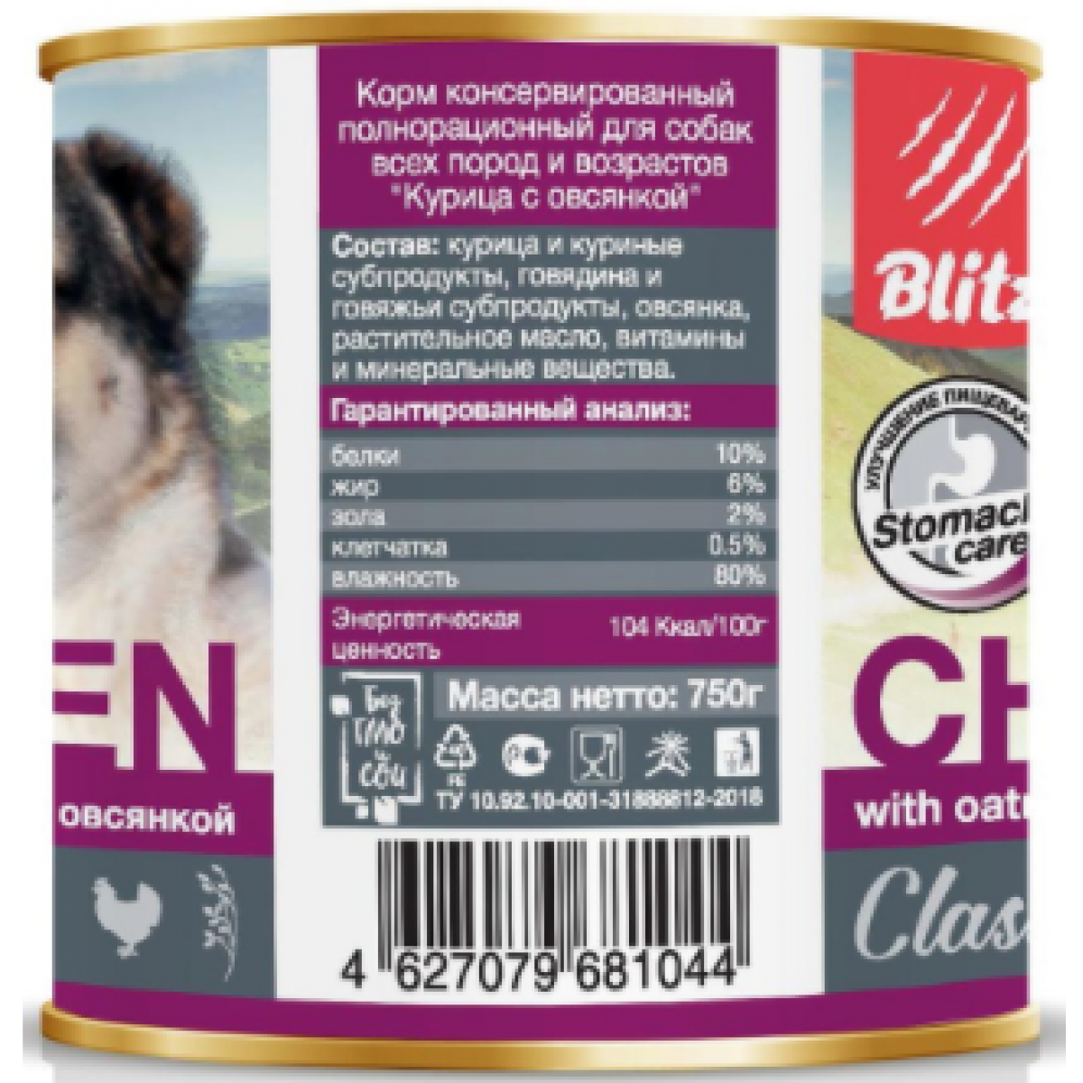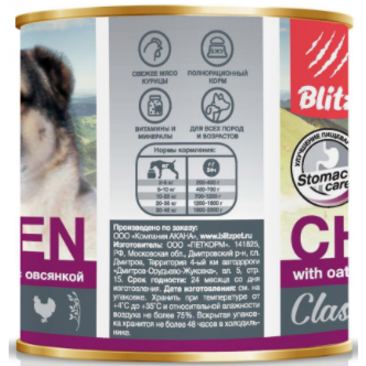 BLITZ Classic Dog Курица с овсянкой - полнорационный влажный корм для собак Blitz на основе натурального мяса курицы и говядины в сочетании с распаренной овсянкой прекрасно подойдёт для ежедневного кормления вашего питомца. Специально разработанная рецептура направлена на поддержание пищеварения и нормализацию кишечной флоры, благодаря овсянке, обладающей высоким содержанием клетчатки и обволакивающим свойством. Комплекс натуральных витаминов и минералов обеспечит вашего питомца всем необходимым для здоровья и полноценной жизни. Корм имеет консистенцию крупнорубленного паштета.