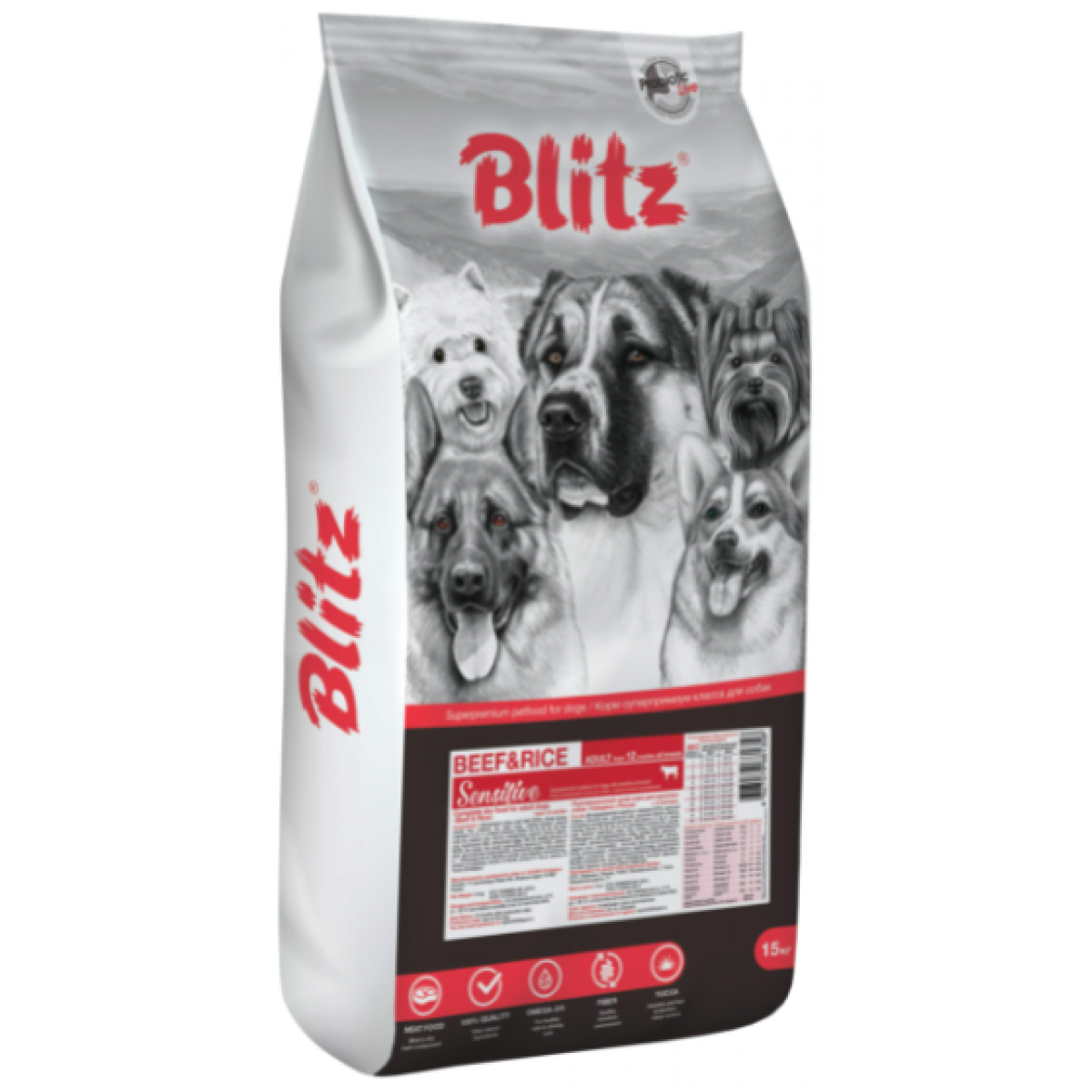 BLITZ Sensitive Adult (Говядина, рис) - полнорационный сухой корм предназначен для собак, пищеварение которых плохо реагирует на наиболее часто встречающиеся в кормах источники животного и растительного белка.