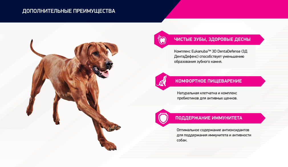 Комплекс Eukanuba™ 3D DentaDefense (3Д ДентаДефенс)  способствует уменьшению образования зубного камня.