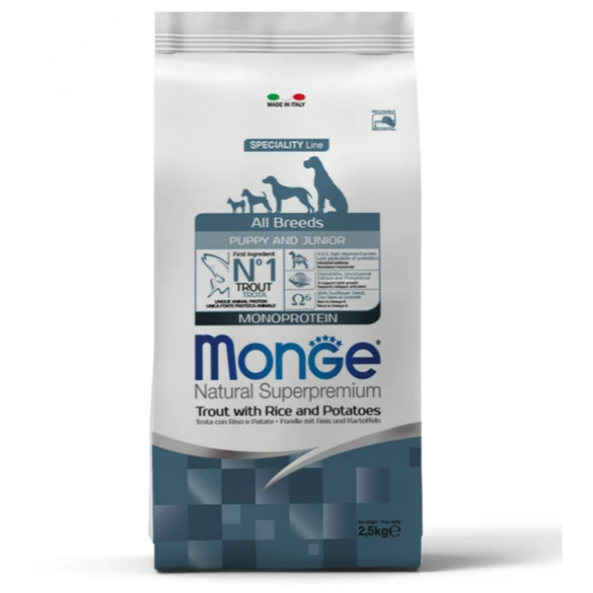Monge (Монж) Dog Speciality Line Puppy & Junior All Breeds сухой корм из форели с рисом и картофелем для щенков всех пород 2,5 кг.