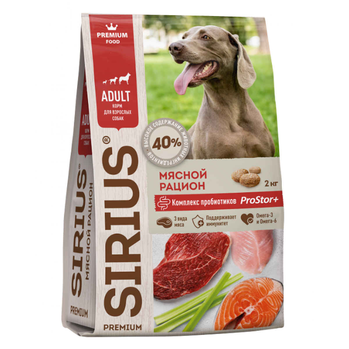 SIRIUS — сухой корм премиум-класса для полноценного ежедневного рациона взрослых собак. Высокое содержание мясных ингредиентов обеспечивает оптимальный уровень белка и укрепляет мышцы. Баланс витаминов и комплекса пробиотиков 4-го поколения PROSTOR+ нормализует пищеварение и укрепляет иммунитет. Омега 3 и Омега 6 способствуют поддержанию здоровья сердца, мозга, нервной системы, здоровья кожи и красоты шерсти.