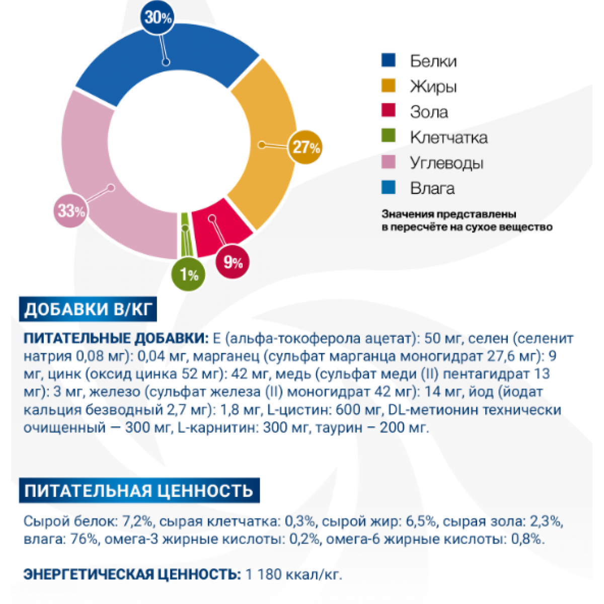 Питательные добавки на кг: витамин D3: 450 МЕ, витамин Е (альфа-токоферола ацетат): 50 мг, селен (селенит натрия 0,08 мг): 0,04 мг, марганец (сульфат марганца моногидрат 27,6 мг): 9 мг, цинк (оксид цинка 52 мг): 42 мг, медь (сульфат меди (II) пентагидрат 13 мг): 3 мг, железо (сульфат железа (II) моногидрат 42 мг): 14 мг, йод (йодат кальция безводный 2,7 мг): 1,8 мг, L-цистин: 600 мг, DL-метионин технически чистый - 300 мг, L-карнитин: 300 мг, таурин – 200 мг.