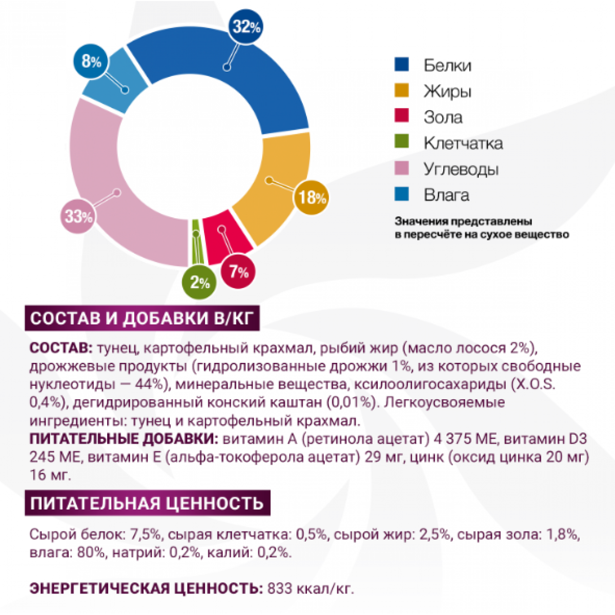 Тунец (соответствует 100% использованного мяса), картофельный крахмал, рыбий жир (масло лосося 2%), дрожжевые продукты (гидролизованные дрожжи 1%, из которых свободные нуклеотиды 44%), минеральные вещества, ксилоолигосахариды (X.O.S. 0,4%), дегидрированный конский каштан (0,01%).ПИТАТЕЛЬНАЯ ЦЕННОСТЬ: сырой белок: 7,5%, сырая клетчатка: 0,5%, сырой жир: 2,5%, сырая зола: 1,8%, влага: 80%, натрий: 0,2%, калий: 0,2%.