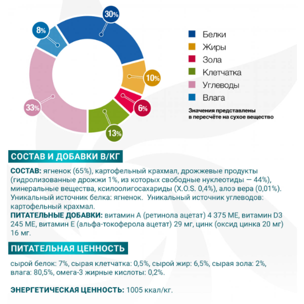 Ягненок (65%), картофельный крахмал, дрожжевые продукты (гидролизованные дрожжи 1%, из которых свободные нуклеотиды 44%), минеральные вещества, ксилоолигосахариды (X.O.S. 0,4%), алоэ вера (0,01%).ксилоолигосахариды (X.O.S. 0,4%), алоэ вера (0,01%).ПИТАТЕЛЬНАЯ ЦЕННОСТЬ: сырой белок: 7%, сырая клетчатка: 0,5%, сырой жир: 6,5%, сырая зола: 2%, влага: 80,5%, омега-3 жирные кислоты: 0,2%.
