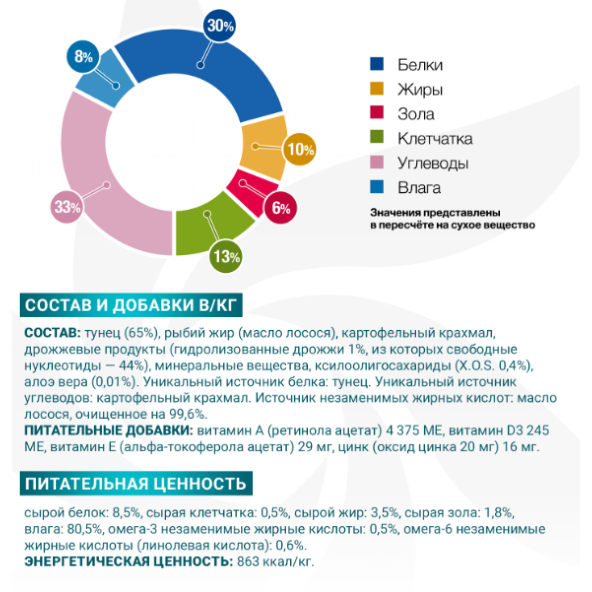 В состав корма входит один источник животного белка (тунец) один источник углеводов (картофельный крахмал).