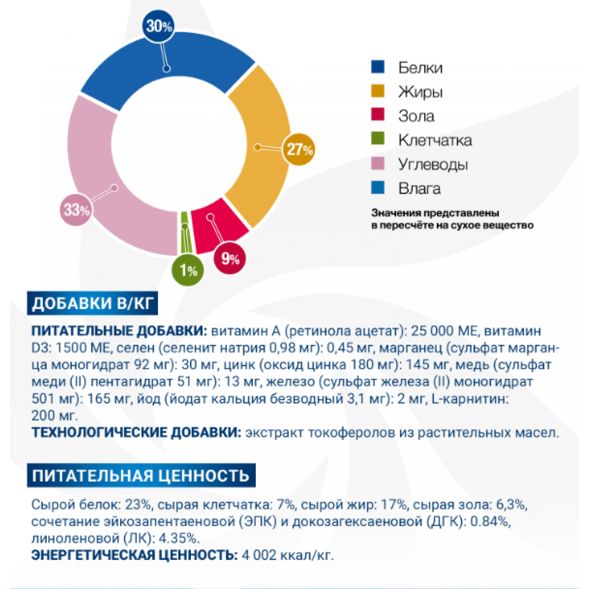 Питательная ценность: сырой белок: 23%, сырая клетчатка: 7%, сырой жир: 17%, сырая зола: 6,3%, сочетание эйкозапентаеновой (EPA) и докозагексаеновой (DHA): 0.84%, линоленовой (LA): 4.35%.