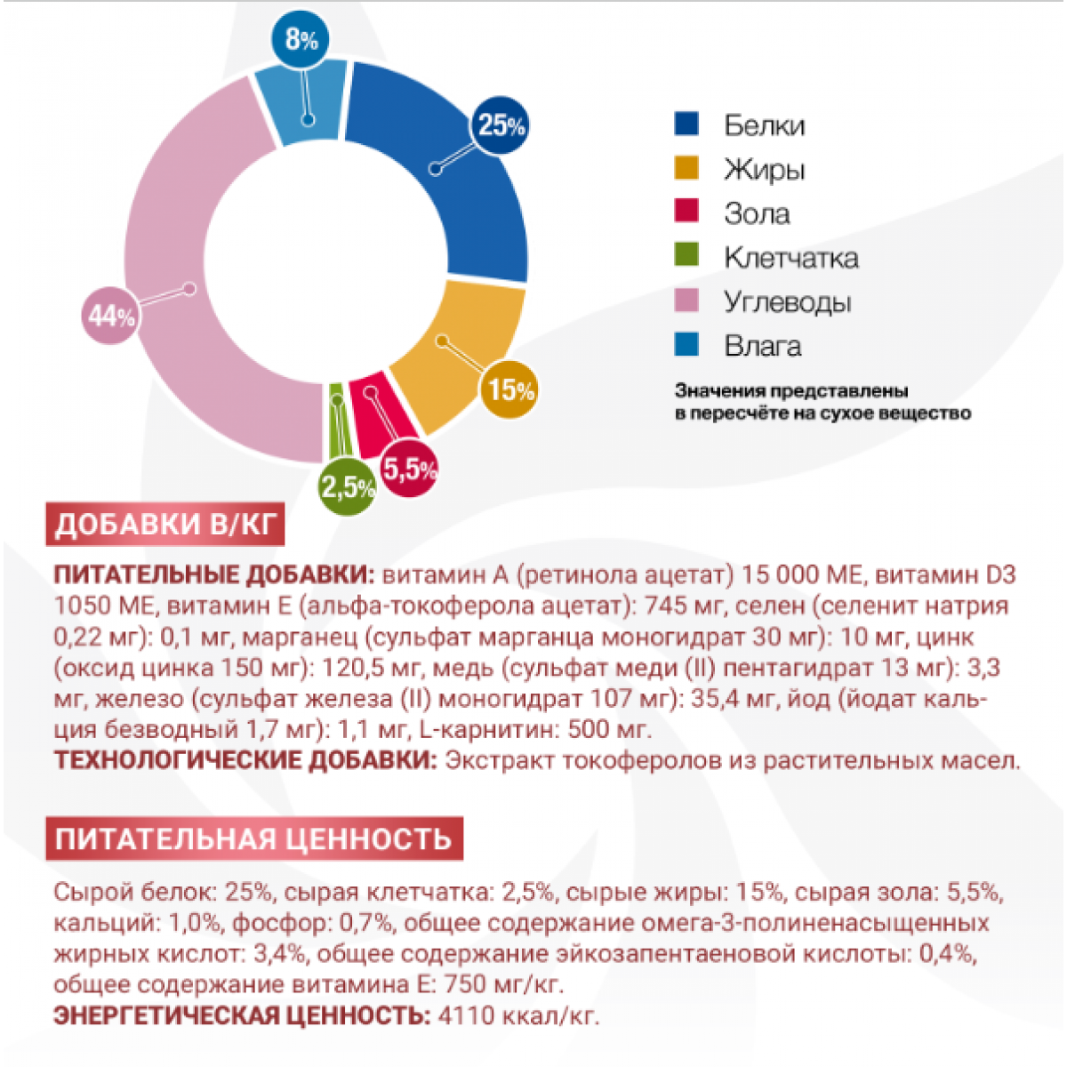 сырой белок 25%, сырая клетчатка 2,5%, сырые жиры 15%, сырая зола 5,5%, кальций 1,0%, фосфор 0,7%, общее содержание жирных омега-3 кислот 3,4%, общее содержание эйкозапентаеновой кислоты 0,4%, общее содержание витамина E 750 мг/кг.