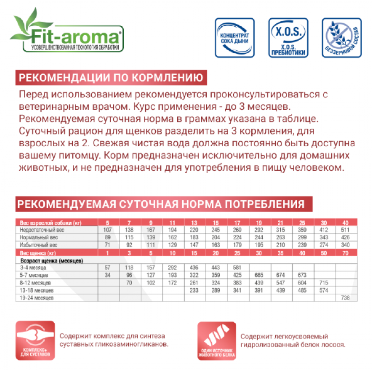 Гидролизованный белок лосося, тапиока, картофель, рыбий жир (лососевый жир 7%)*, животный жир (утиный жир)*, сухая свекольная пульпа, гидролизованный животный белок, минеральные вещества, пивные дрожжи, гороховая клетчатка, ксилоолигосахариды (XOS 0,4%), продукты переработки растений (босвеллия (Boswellia serrata) 0,23%), глюкозамин (0,057%), хондроитина сульфат (0,04%), продукты и субпродукты переработки свежих фруктов и овощей (концентрат сока дыни (Cucumis melo cantalupensis) источник супероксиддисмутазы 0,005%). *очищенный на 99,6%, консервированный с помощью натуральных антиоксидантов.Питательная ценность: