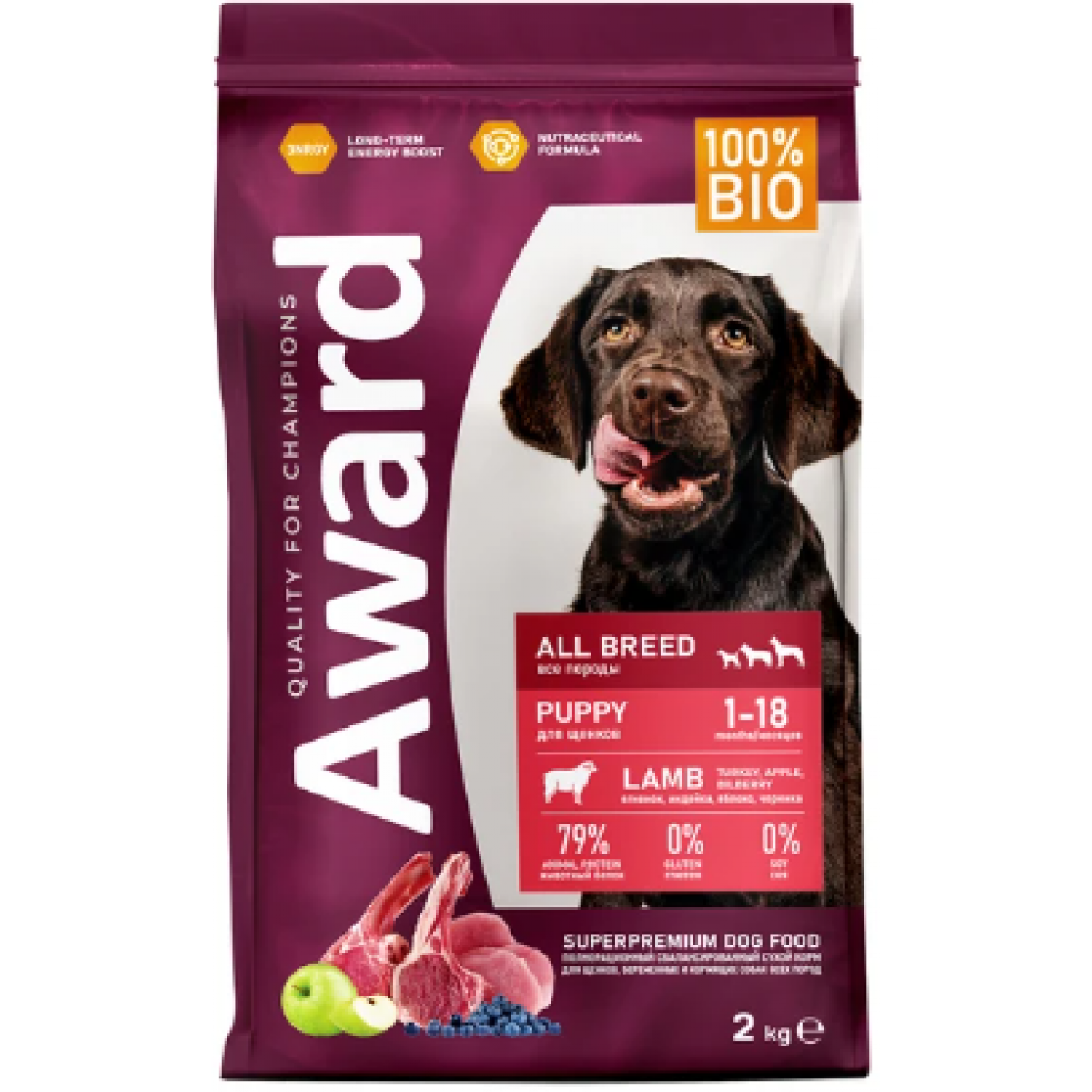 Сухой корм AWARD для щенков от 1 месяца, беременных и кормящих сук всех пород с ягненком и индейкой с добавлением яблока и черники.