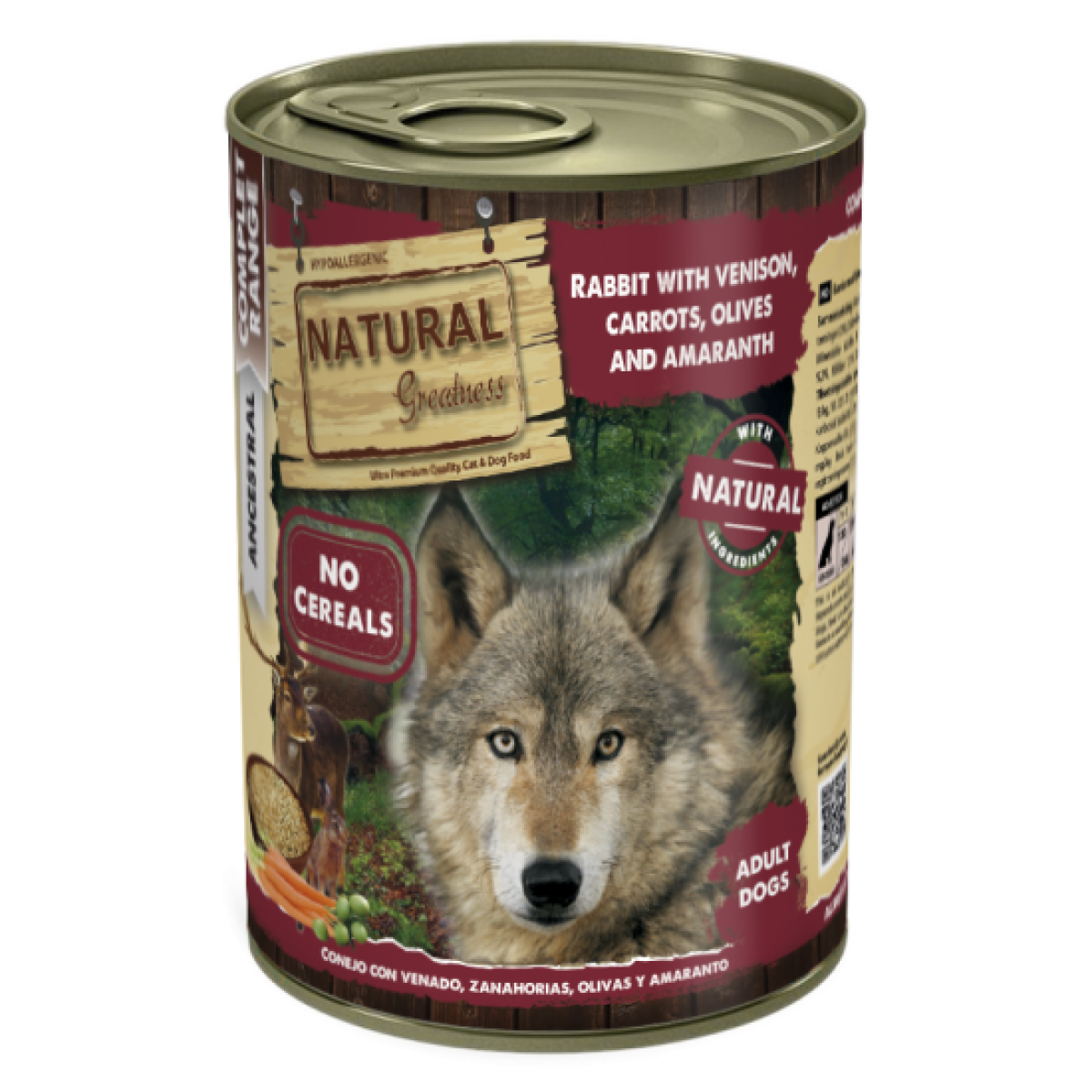 Natural Greatness Кролик с олениной, морковью, оливками и амарантом — это превосходный полнорационный, гипоаллергенный влажный корм ультра-премиум класса, разработанный без злаков для взрослых собак.