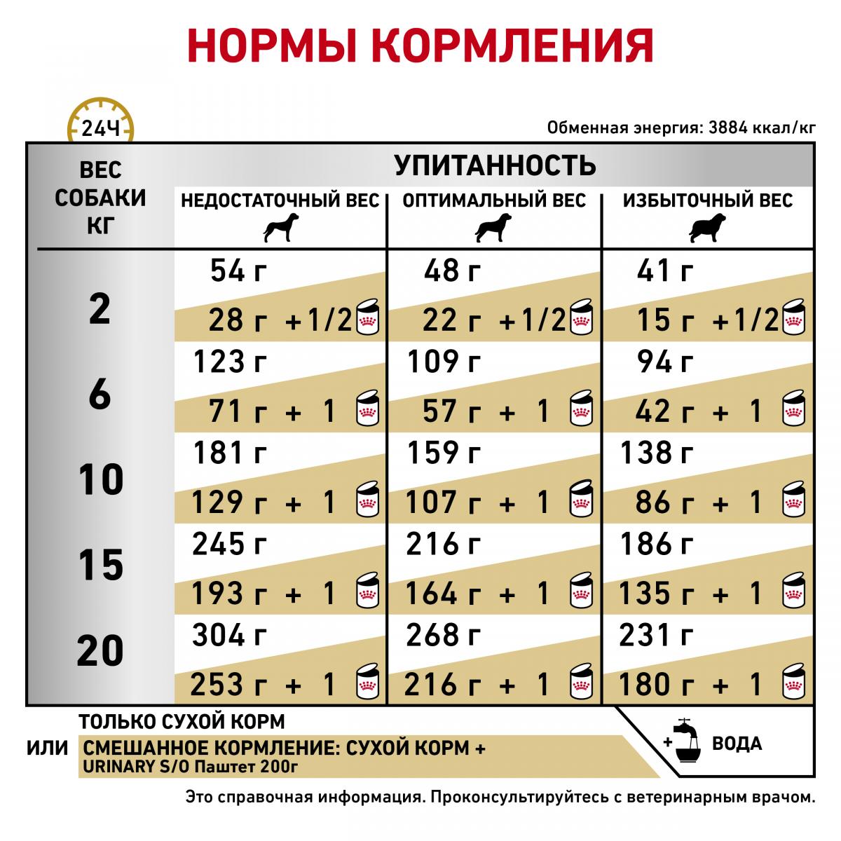 С целью растворения струвитных камней диетический рацион Urinary S/O Canine назначают для применения в течение 5-12 недель. В случае инфицирования мочевыводящих путей срок назначения Urinary S/O Canine в комплексе с антибиотиком должен составить не менее одного месяца после получения отрицательных результатов бактериологического анализа мочи.