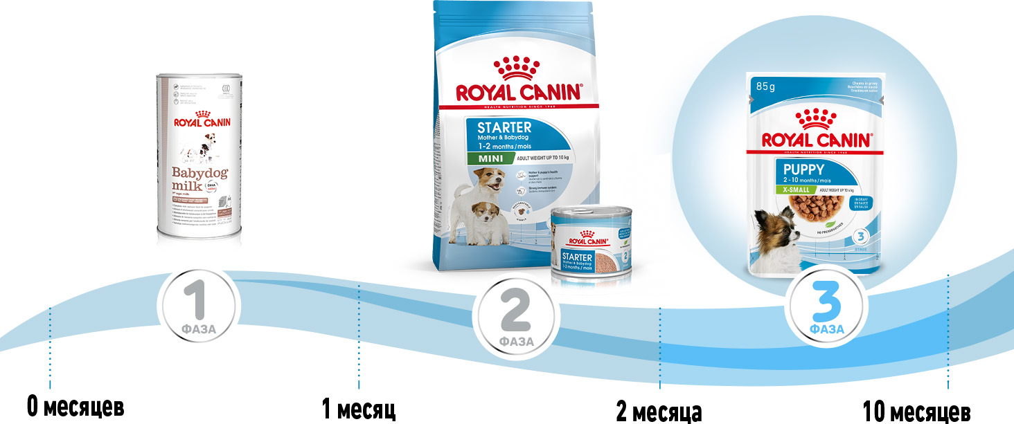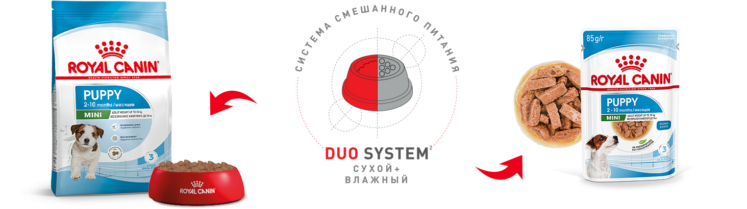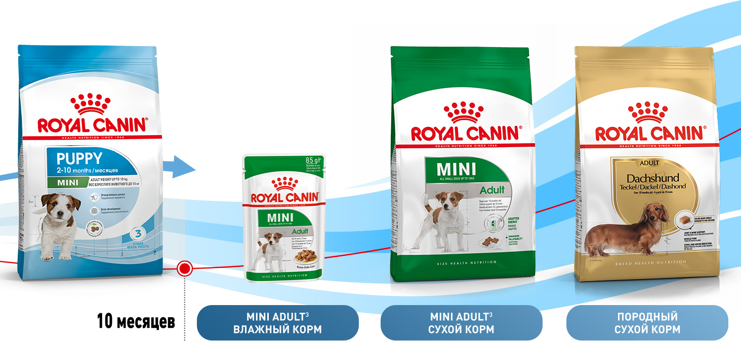 Специально разработанные гранулы продукта ROYAL CANIN® Mini Puppy подходят для маленьких челюстей щенков и облегчают процесс захватывания и разгрызания корма, а также поддерживают здоровье полости рта за счет эффекта механической очистки зубов во время разгрызания.В возрасте 10 месяцев период роста подойдет к завершению, и потребности вашего щенка в питательных веществах изменятся. Ему будет необходим другой рацион, разработанный специально для взрослых собак мелких размеров. В этом возрасте вы сможете перевести своего питомца на корм ROYAL CANIN® Mini Adult, представленный в виде сухих гранул или влажных кусочков в соусе.