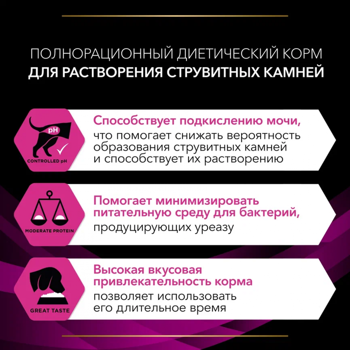 Корм рекомендуется для растворения струвитных камней, увеличивающий