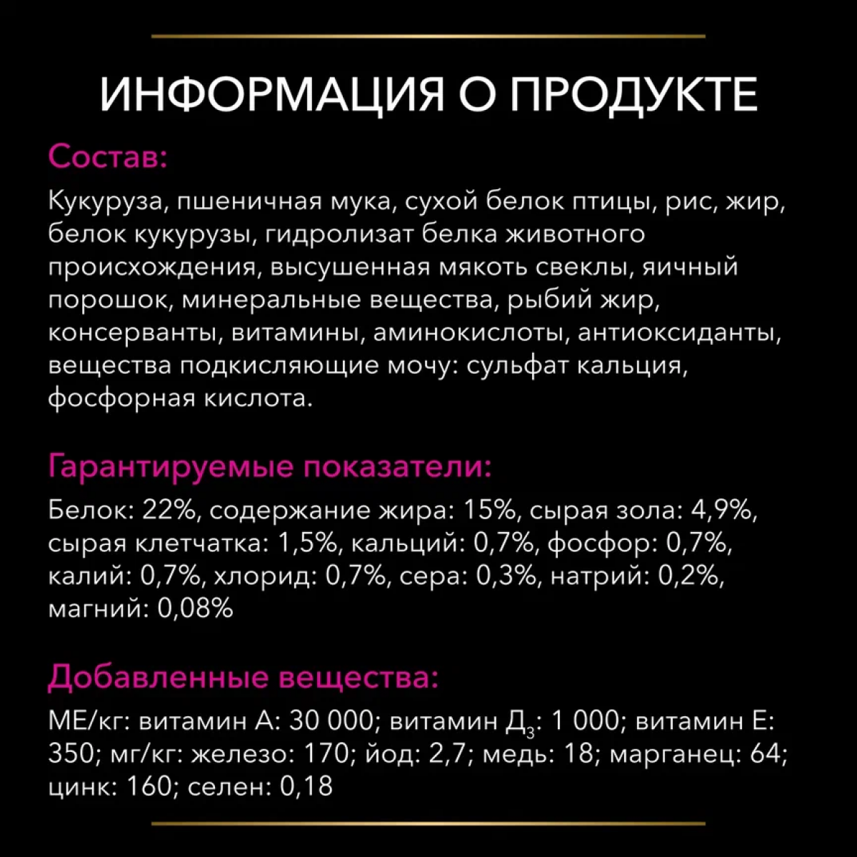 Аналитический состав: белок: 22%, жир: 15%, сырая зола: 4,5%, сырая клетчатка: 1,5%.