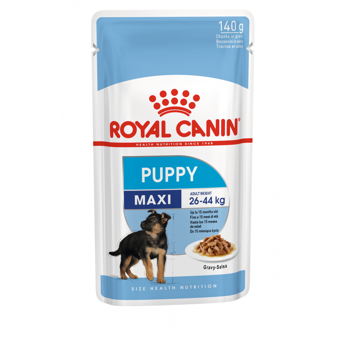 Продукт «ROYAL CANIN® Maxi Puppy кусочки в соусе» для щенков крупных собак в возрасте до 15 месяцев (вес взрослой собаки от 26 до 44 кг) разработан с учетом их потребностей в питательных веществах.